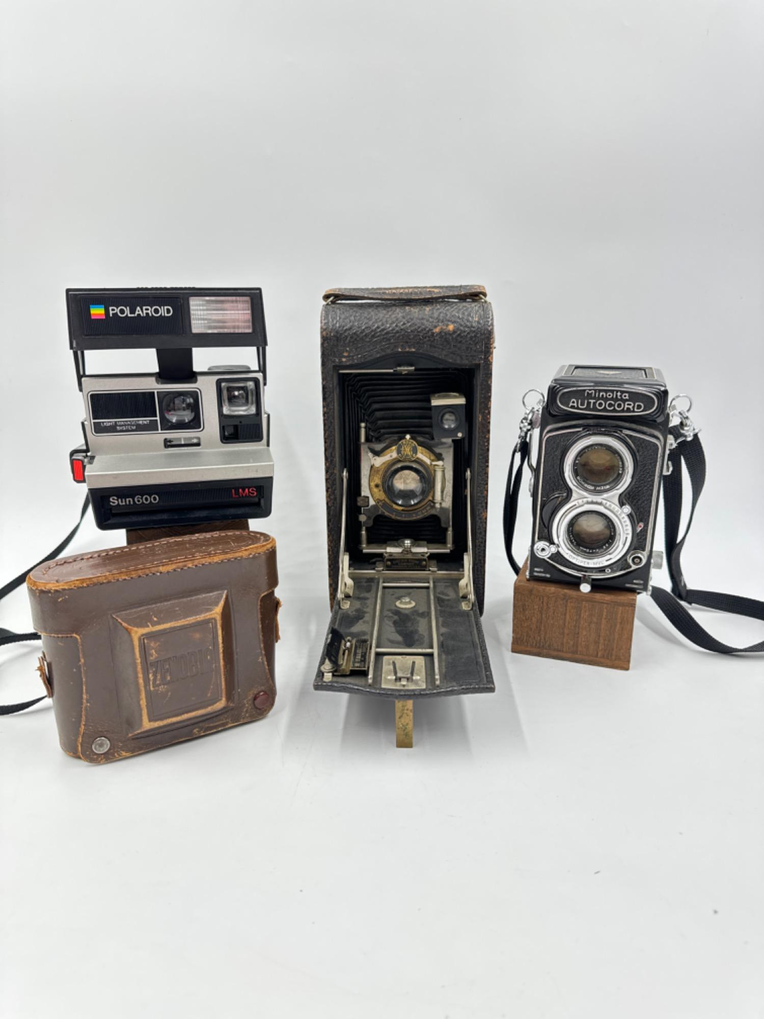 Minolta AUTOCORD Antique Kodak ( possibly No 3A?) Folding Pocket Camera Vintage 1954 DAIICHI Zenobia Japanese lightweight folding camera - uses 120 roll film Polaroid Sun 600 LMS Land Camera