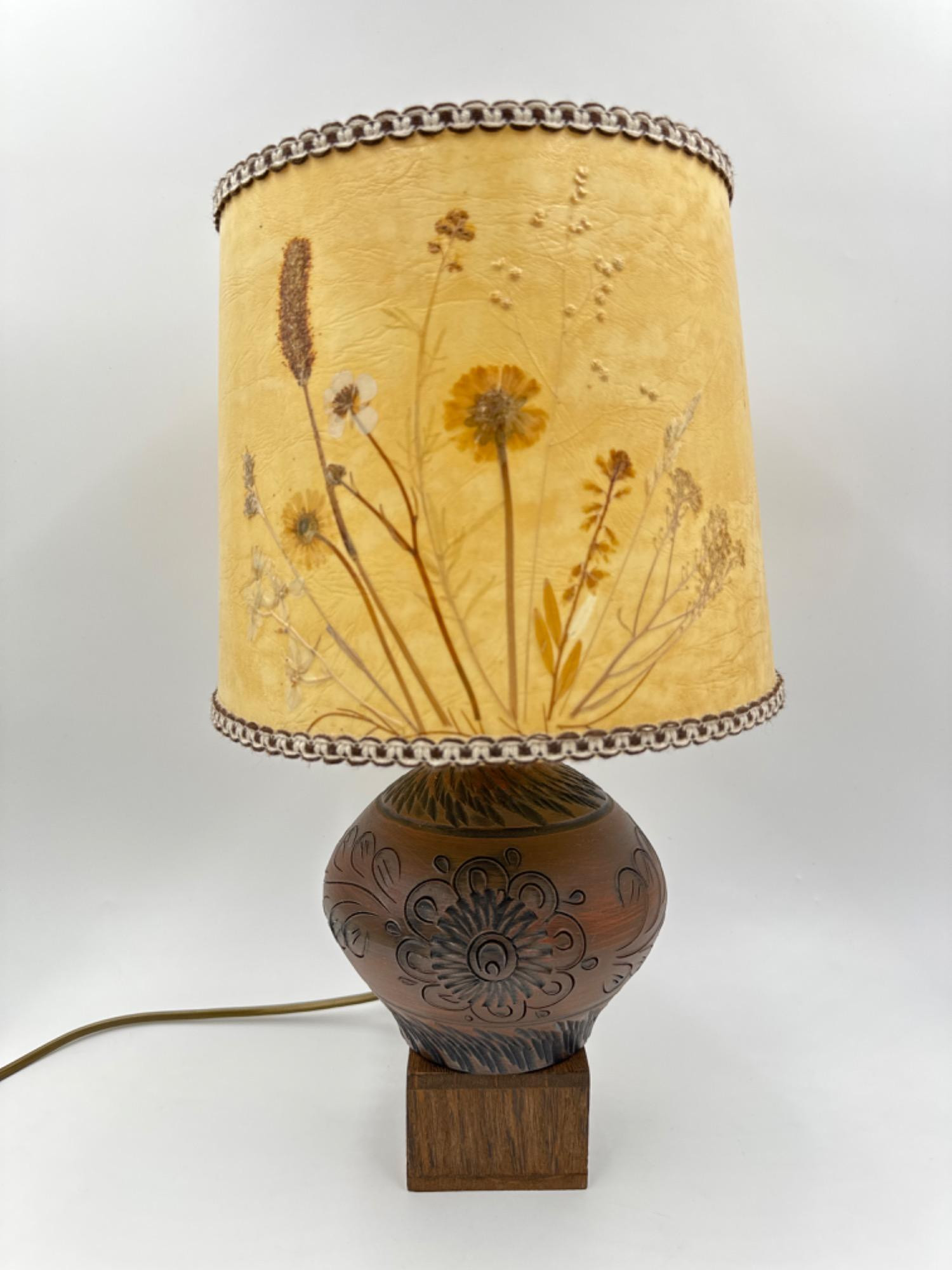 Lot # 139 - Retro Incised Pottery Lamp w/Pressed Flower Lampshade