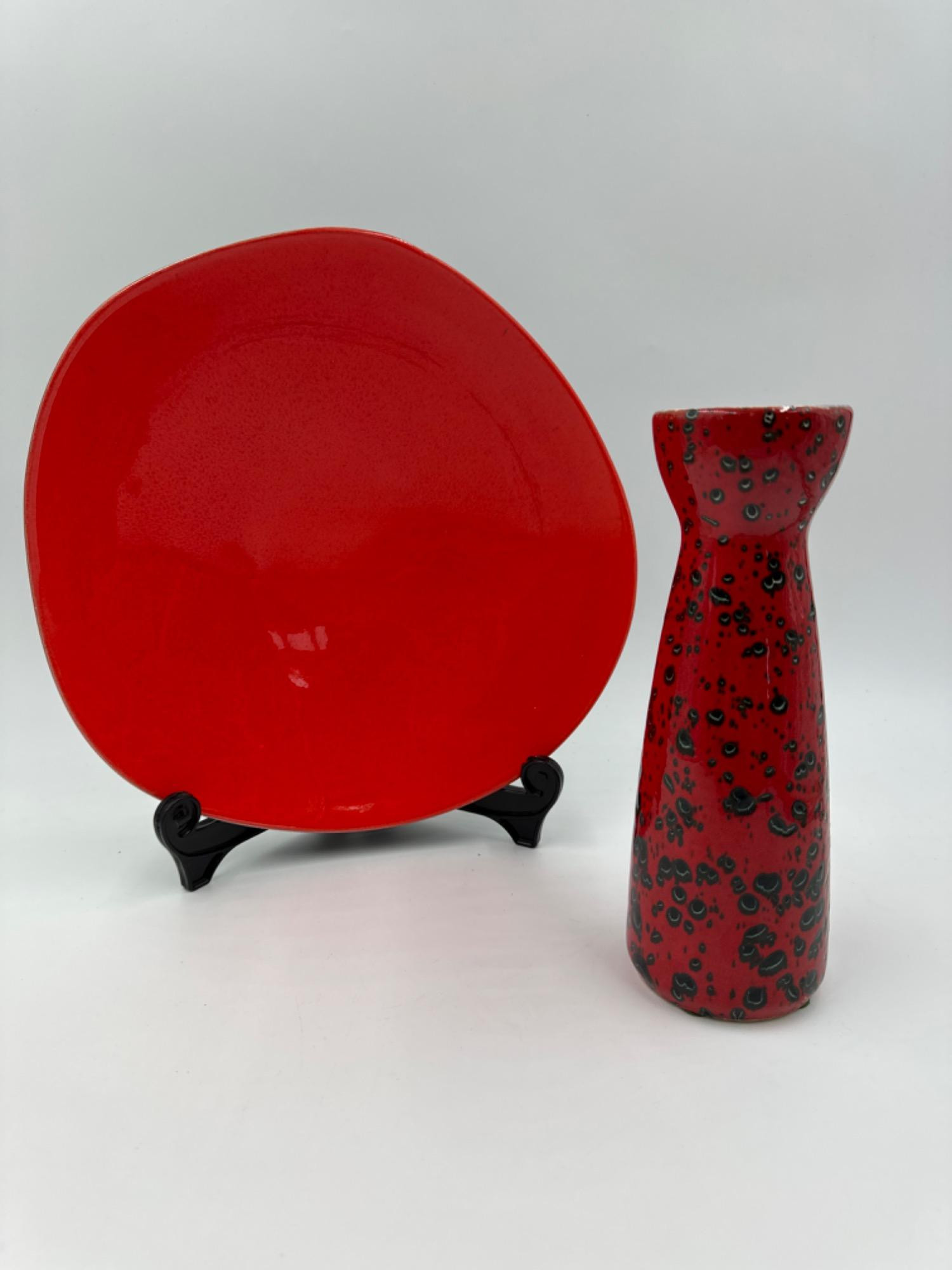 1960s West Germany Flaming Red Scheurich Ceramic Vase - 9” - Excellent condition Red Pottery Art Bowl - signed N. Best - 11-11.5”D