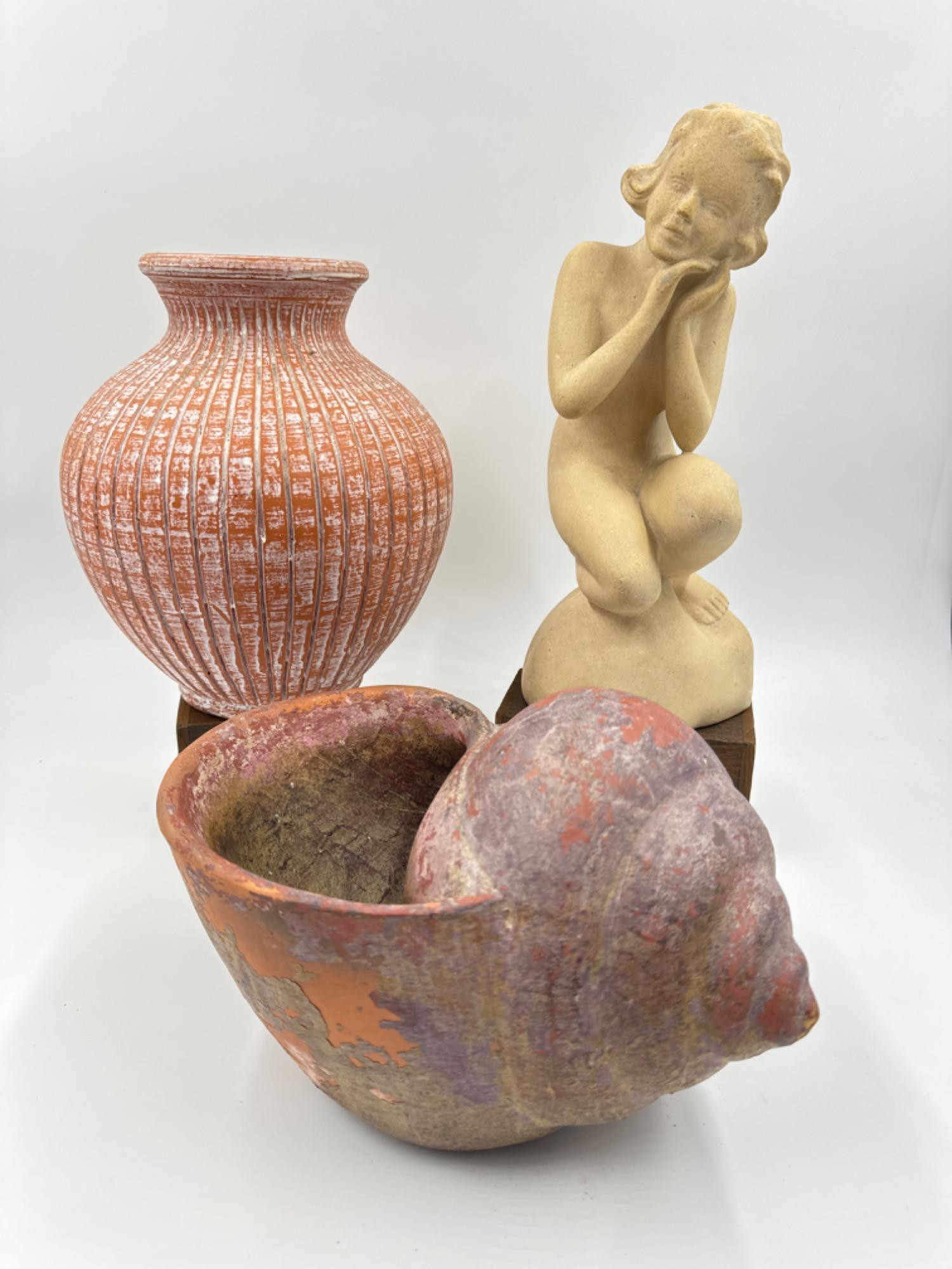 Ove Rasmussen Sitting naked woman composite stone 13” Statue 10.5” terracotta incised vase 12”L x 6.5"T - Terracotta conch shell planter