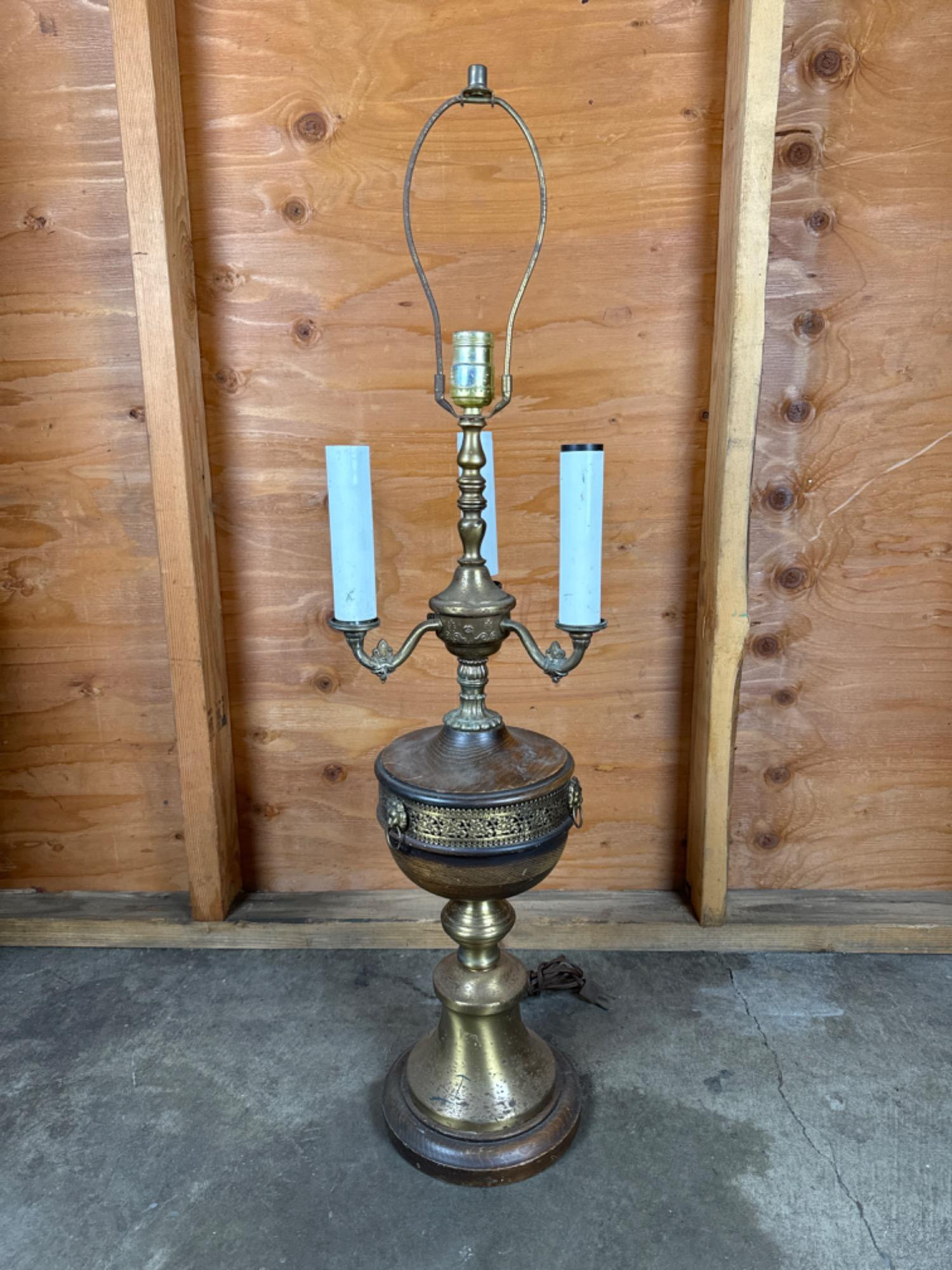 Vintage Wood & Brass Tone Candelabra Table Lamp Needs refinishing, untested 35.5”T to finial