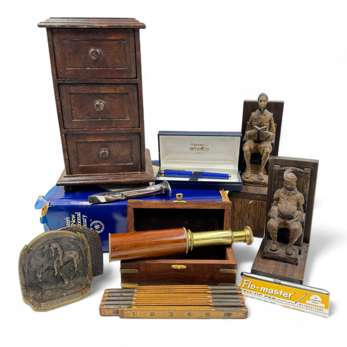 I'll Be in My Study Wood & Brass Telescope Wood 3 drawer chest - 12”T x 7”D x 6.75”W 6.75”T wood bookends 4” End of the trail metal bookends Folding Ruler Francesco Smalto Fountain Pen Vintage Webster dictionary