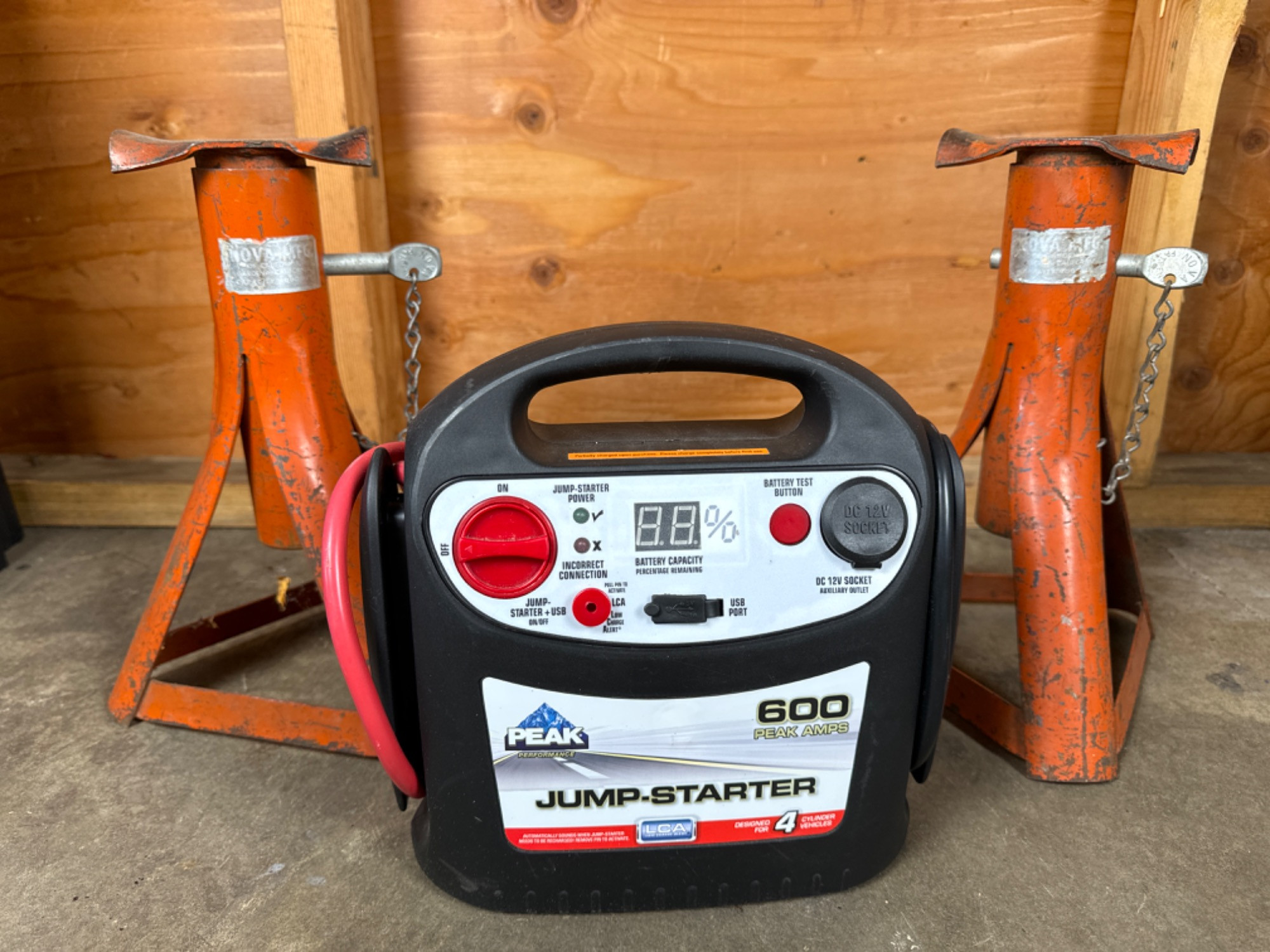Peak 600 Battery Jump Starter & 2 Nova Tripod Jack Stands Battery jump starter is untested