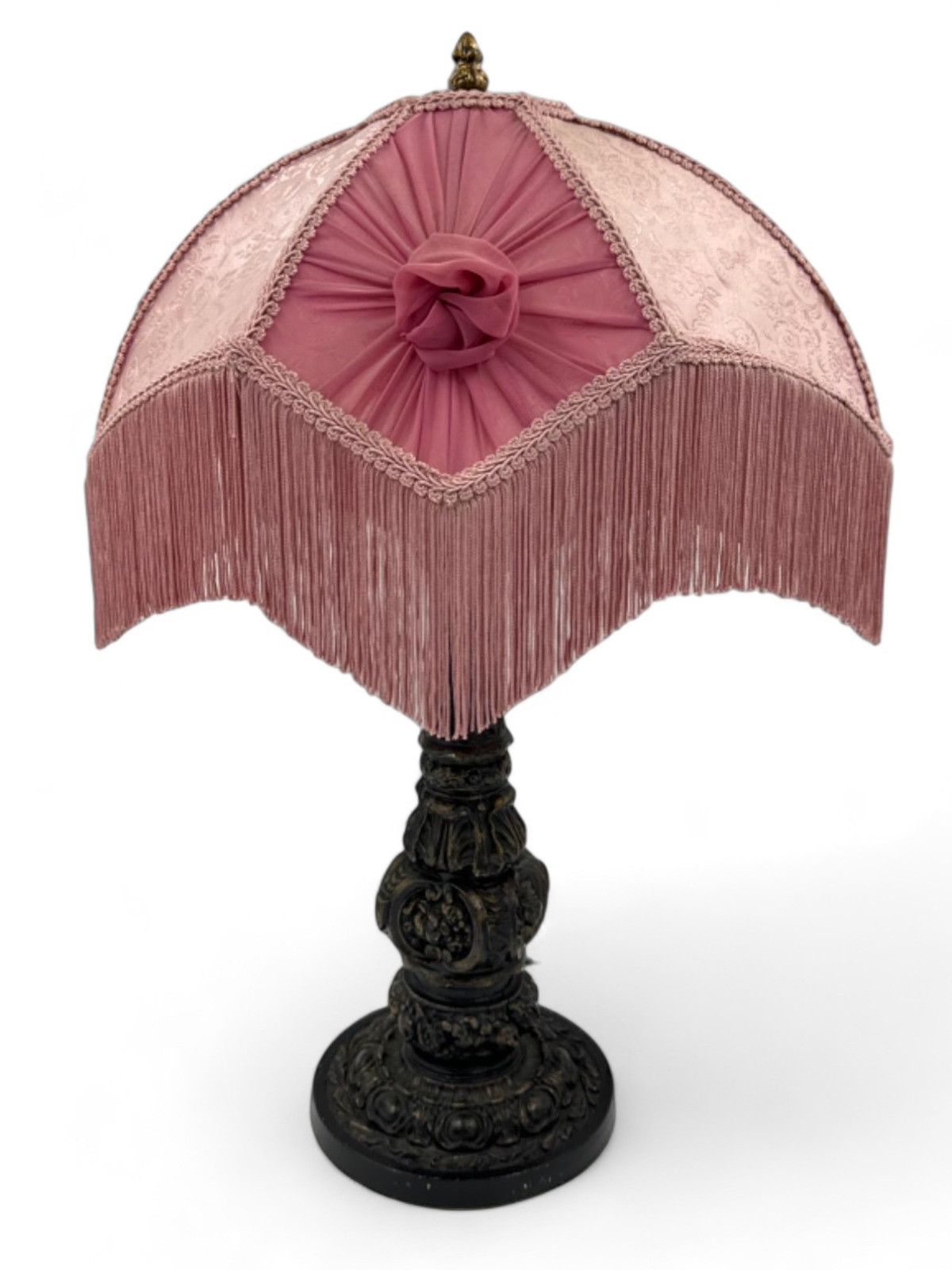 Antique H.A. Best Lamp Co Cast Metal Table Lamp w/Fringe Shade 23”T 7”D Metal has a crack. Untested. Shade is in great condition