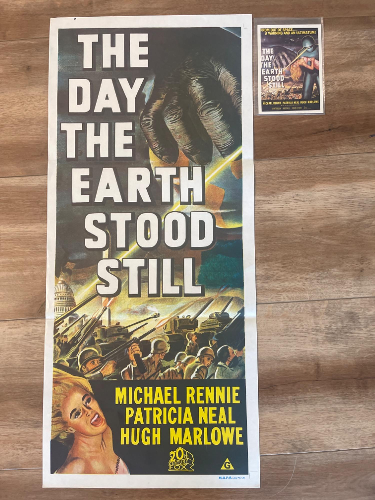 Original 1970s Australian “The Day The Earth Stood Still” Movie Daybill: 13.25 inches W x 30 inches H - Has been folded, shown in photos - Small tear at the top, otherwise great condition. Paris Postcard: 4 inches W x 6 inches H