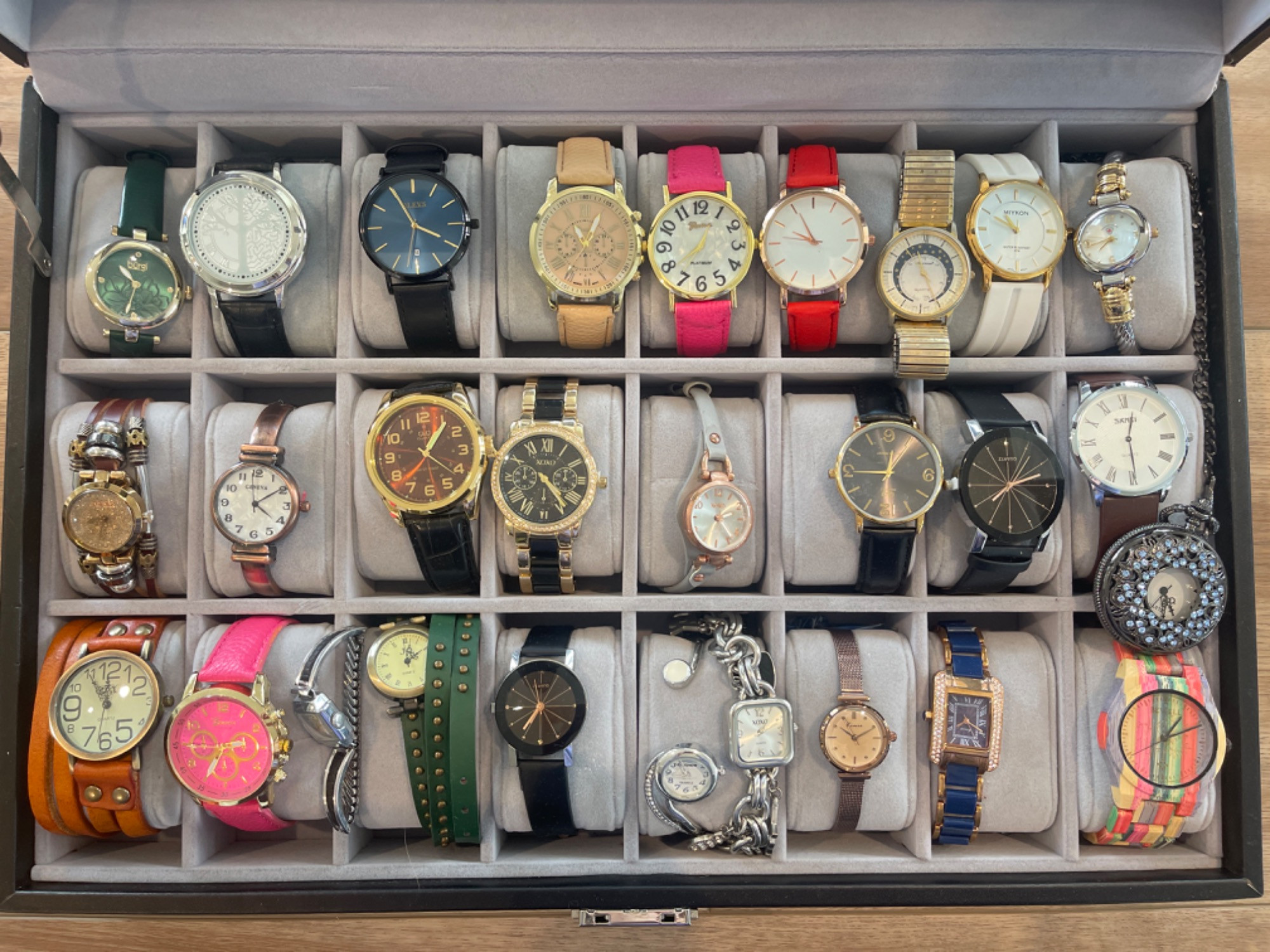 Inside lining of box top are peeling off, but could be reattached with the right adhesive. All are ladies watches All UNTESTED.