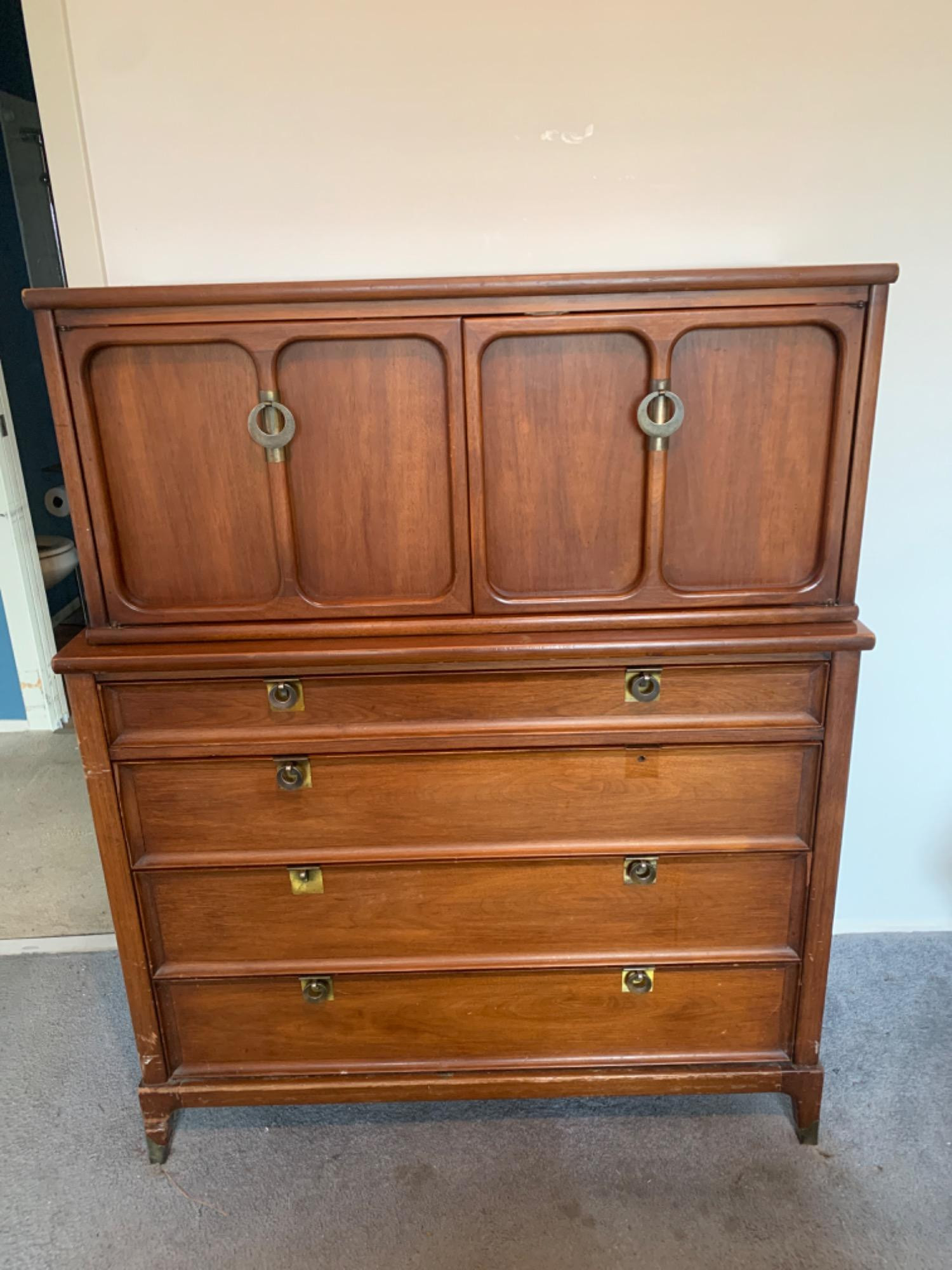 Vintage Walnut Dresser made by White Fine Furnishings. Two parts that make loading easier. Two pieces of hardware need repaired. 40L x 19W x 49T