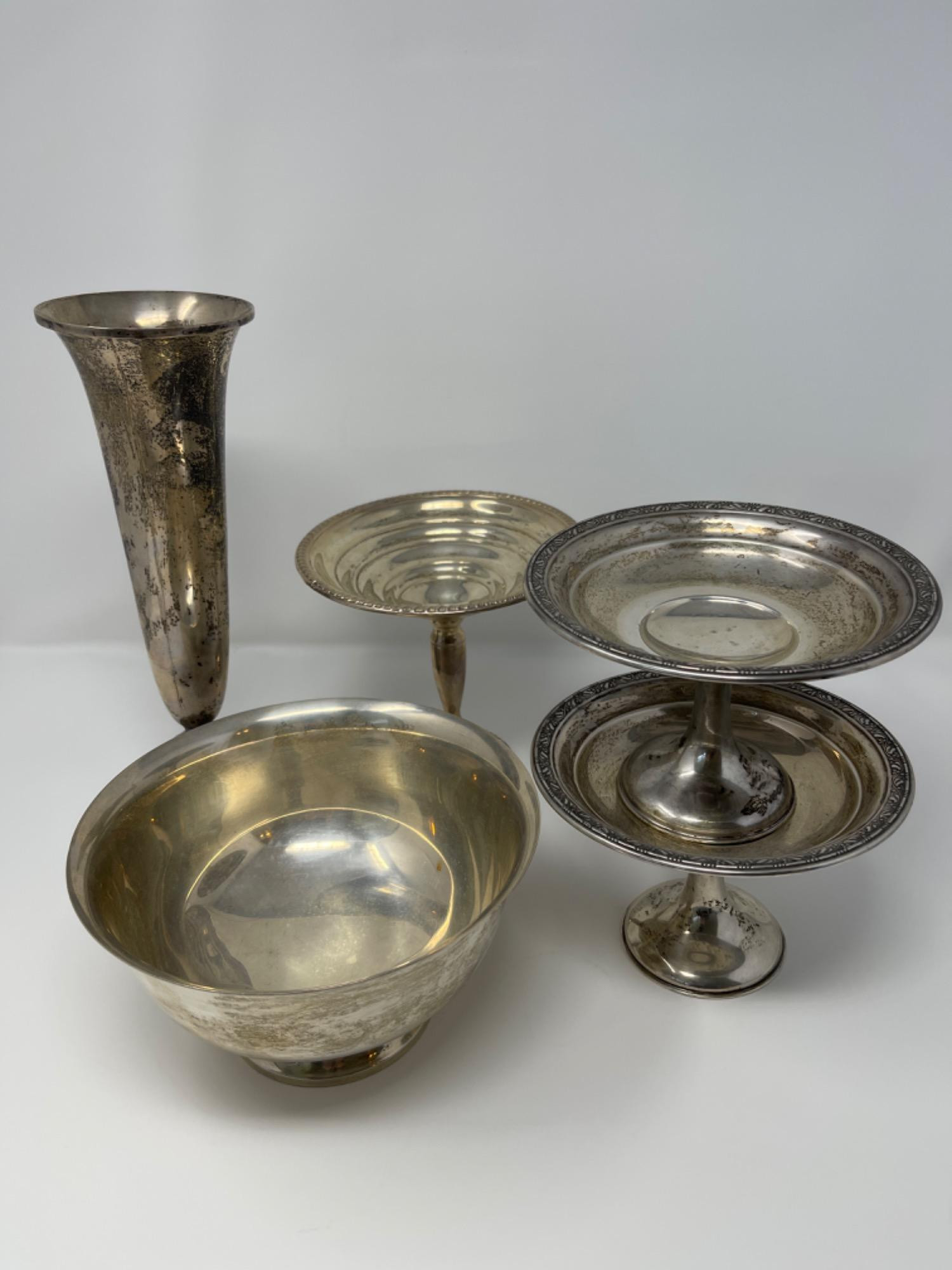 This lot has several sterling items. The tall sterling vase is weighted, measures 11 inches tall. Two compote bowls made by Wallace marked Sterling 4206. The base is cement filled and they measure 4 inches tall. Each sterling marked 181. Paul Revere bowl is not weighted and measures 4 inches tall by 7 inches wide. Another compote bowl that marked sterling at the bottom, measures 6 inches tall by 6 inches wide. Please see pictures for all the weights.