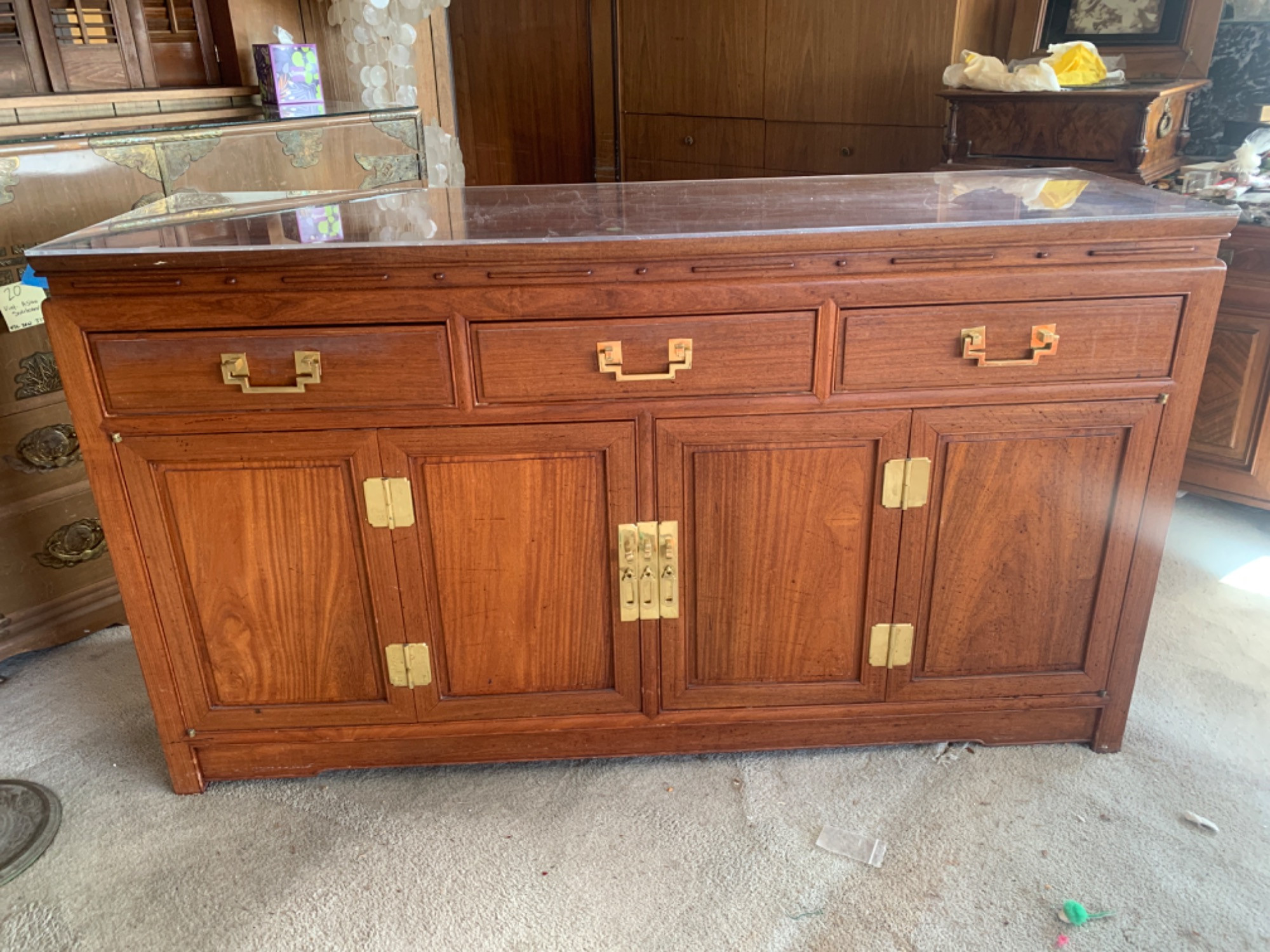 Handsome solid rosewood Chinoiserie Hollywood Regency buffet or credenza by George Zee. It is in fabulous vintage condition. Three drawers with hinged four door front that house lower shelving. Measures- 60L x 33.5T x 19W Heavy, bring help to load. Glass top cut to size.