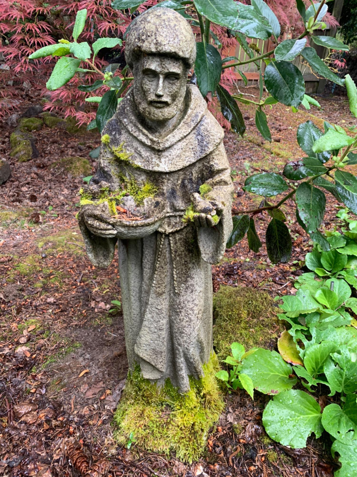 Dimensions are 31 inches tall, 10 inches long, 9 inches wide. Heavy, Solid cement. May hold bird seed.