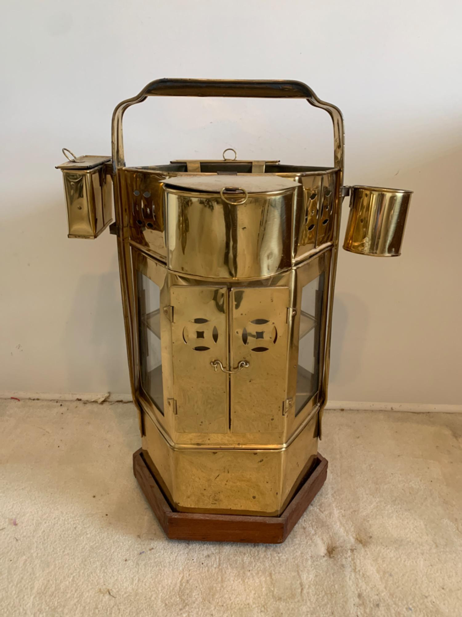 Large oil lamp is 30in tall, 14in diameter. Rolling wood base is removable. Accessories included that hook onto rim for matches, wicks etc...