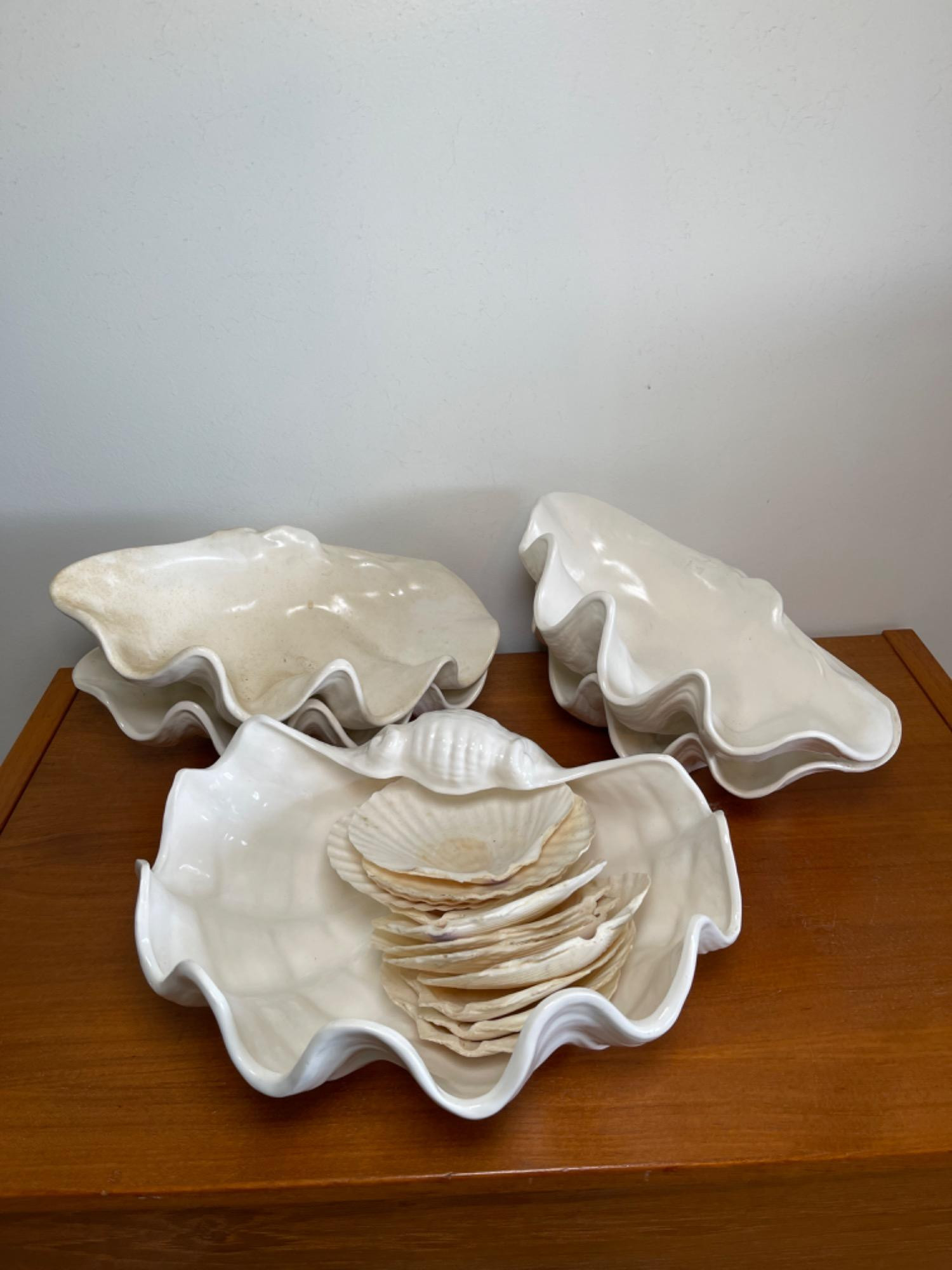 This lot includes four scalloped ceramic serving bowls, that measure 14 inches long by 8 inches deep by approximately 4 in tall. Those four match. There’s also a larger ceramic clamshell bowl. Dimensions are 14in by approximately 4in tall, but it’s a different style. There are several scalloped shells (real), that could also be used as serving dishes.