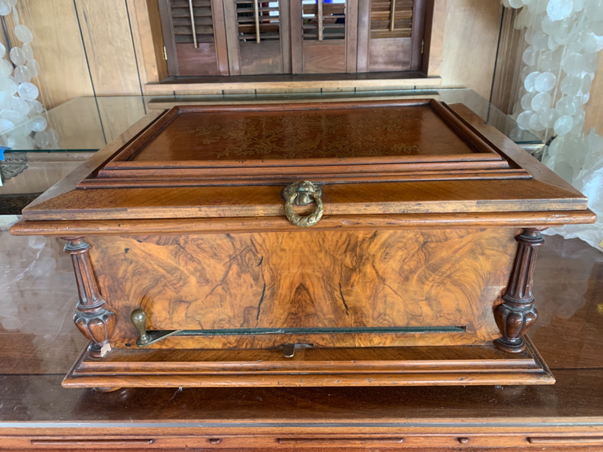 Burl wood case is 19.5L x 15W x 9.5T It works and has vintage sound. Box of 20 discs found later. Two different size discs.