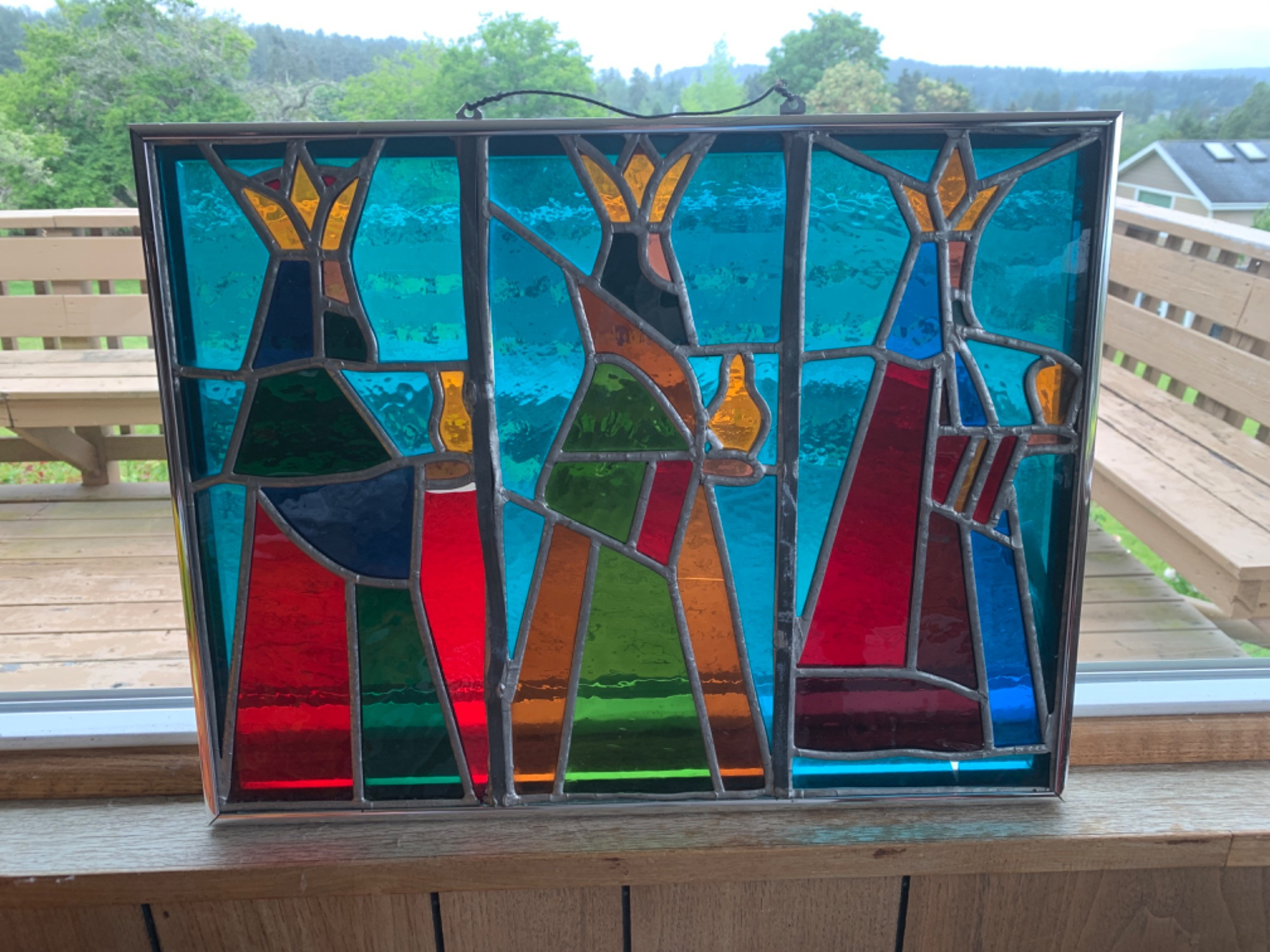 Beautiful framed stained-glass window is 18.5W x 14.5T. Heavy metal frame.