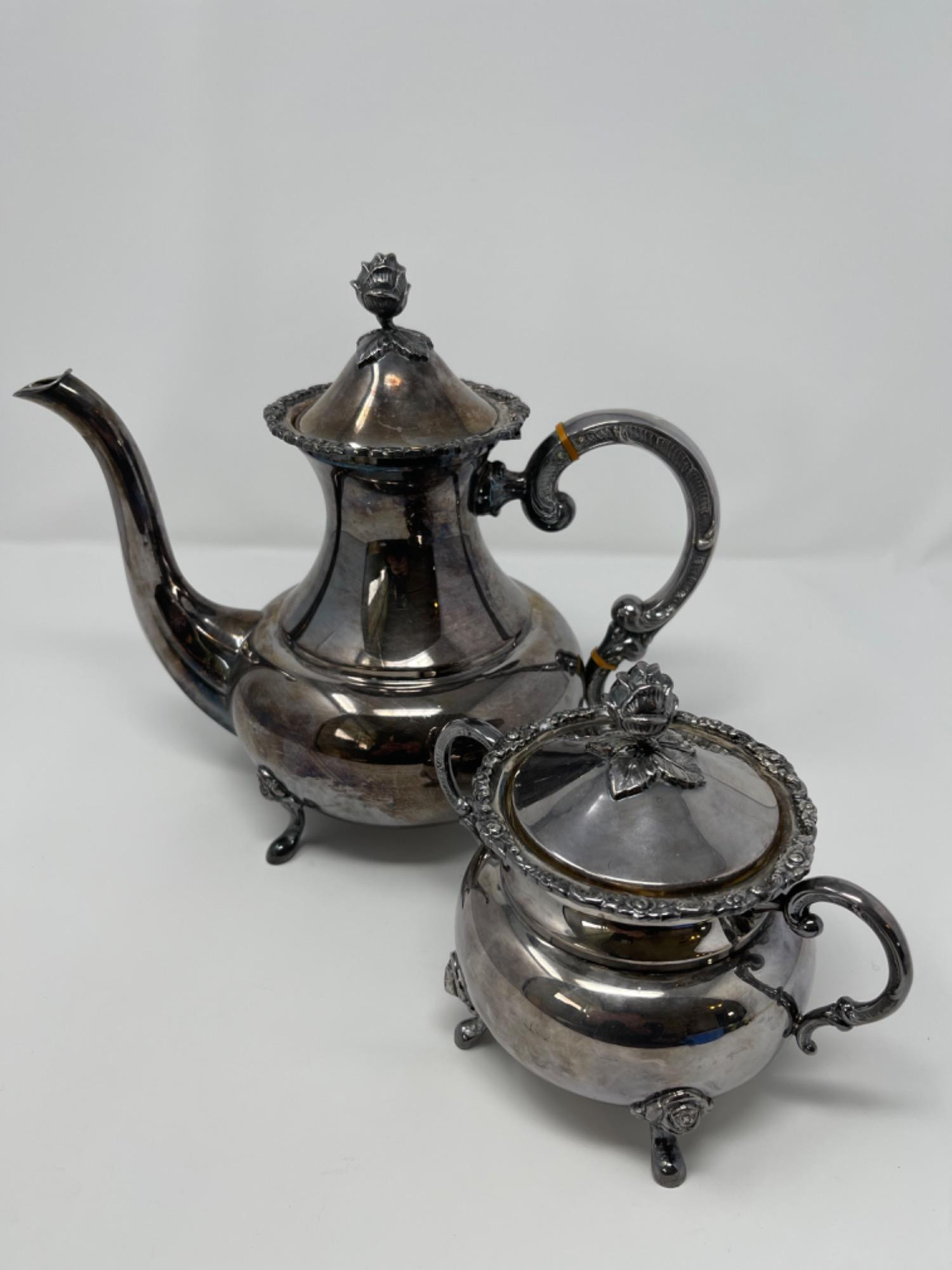 Both of these pieces read sterling by the same maker the coffee pot measures 9 1/2 inches tall by approximately 11 inches wide. The lid dish measures 6 inches tall by 7 1/2 inches wide. Please see pictures for weight of sterling by grams.
