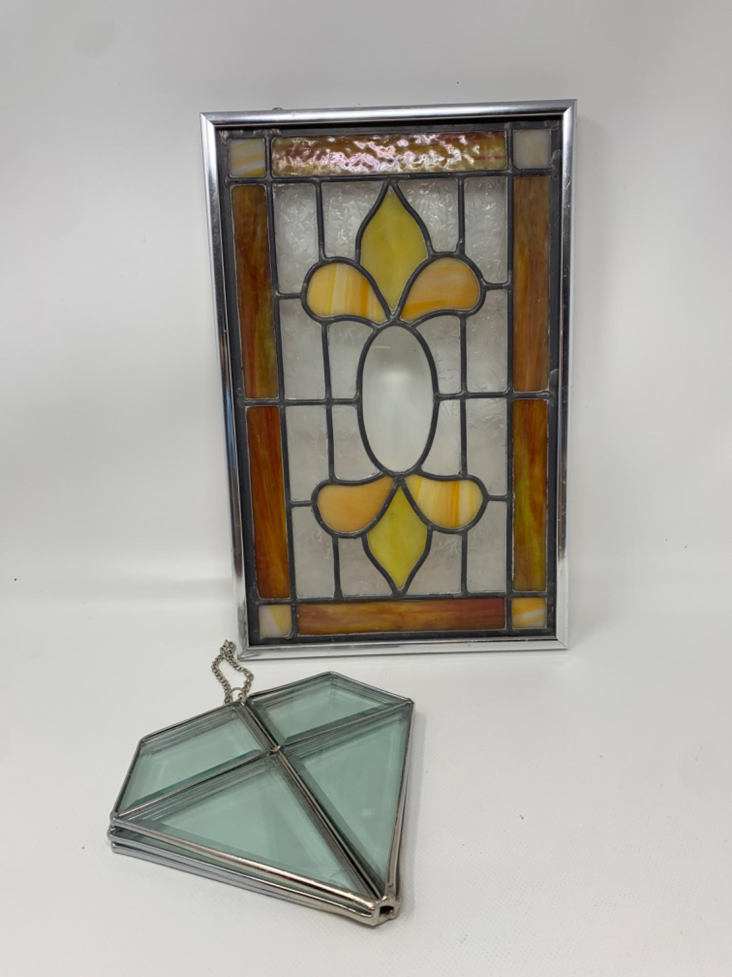 Large craftsman style stained-glass window. Dimensions are 9.25W x 14.5T. Nicely framed. Smaller, heavy beveled clear glass window decor.