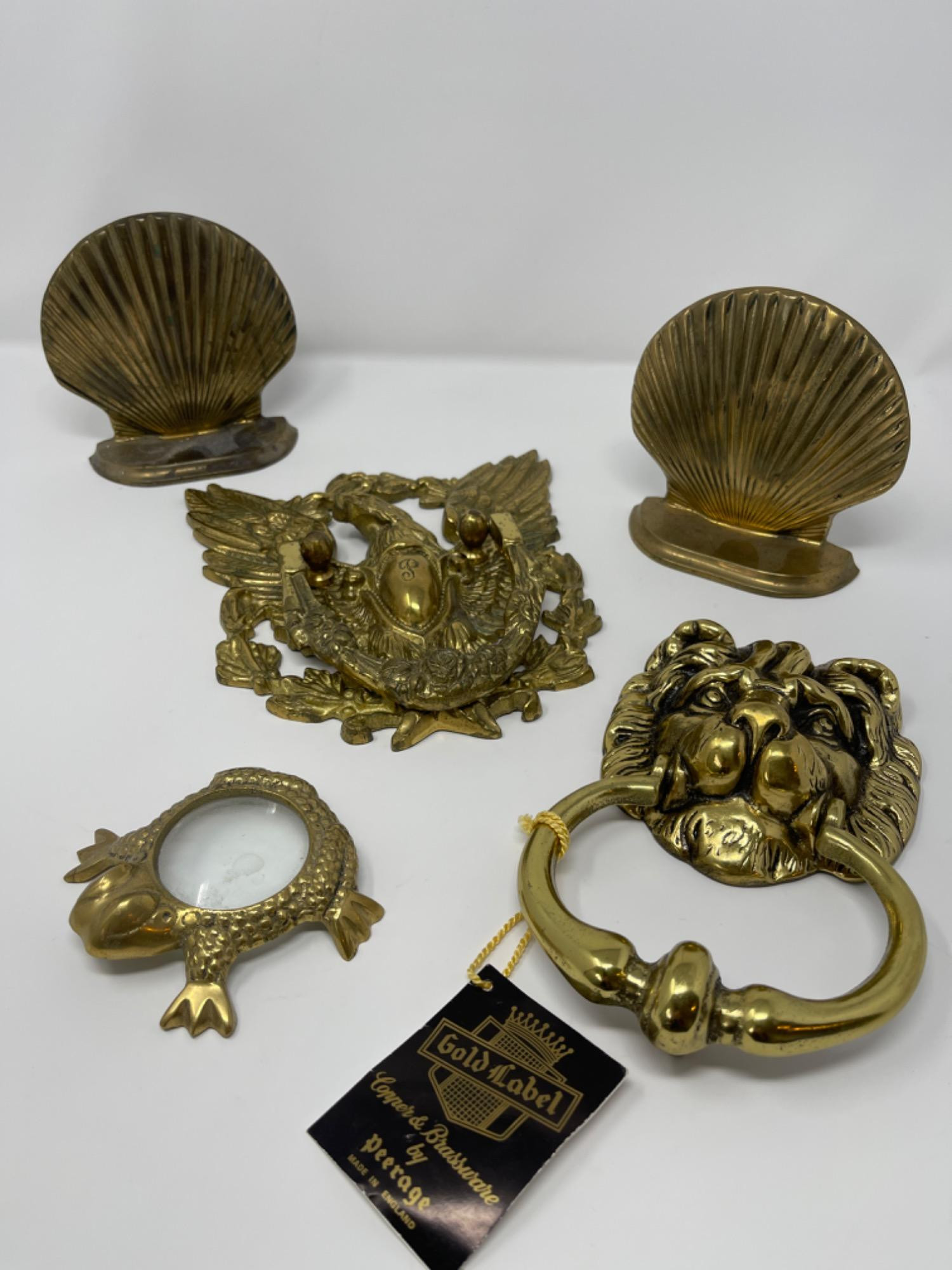 Lot # 53 - Brass Door Knockers, Bookend and Frog Magnifying Glass
