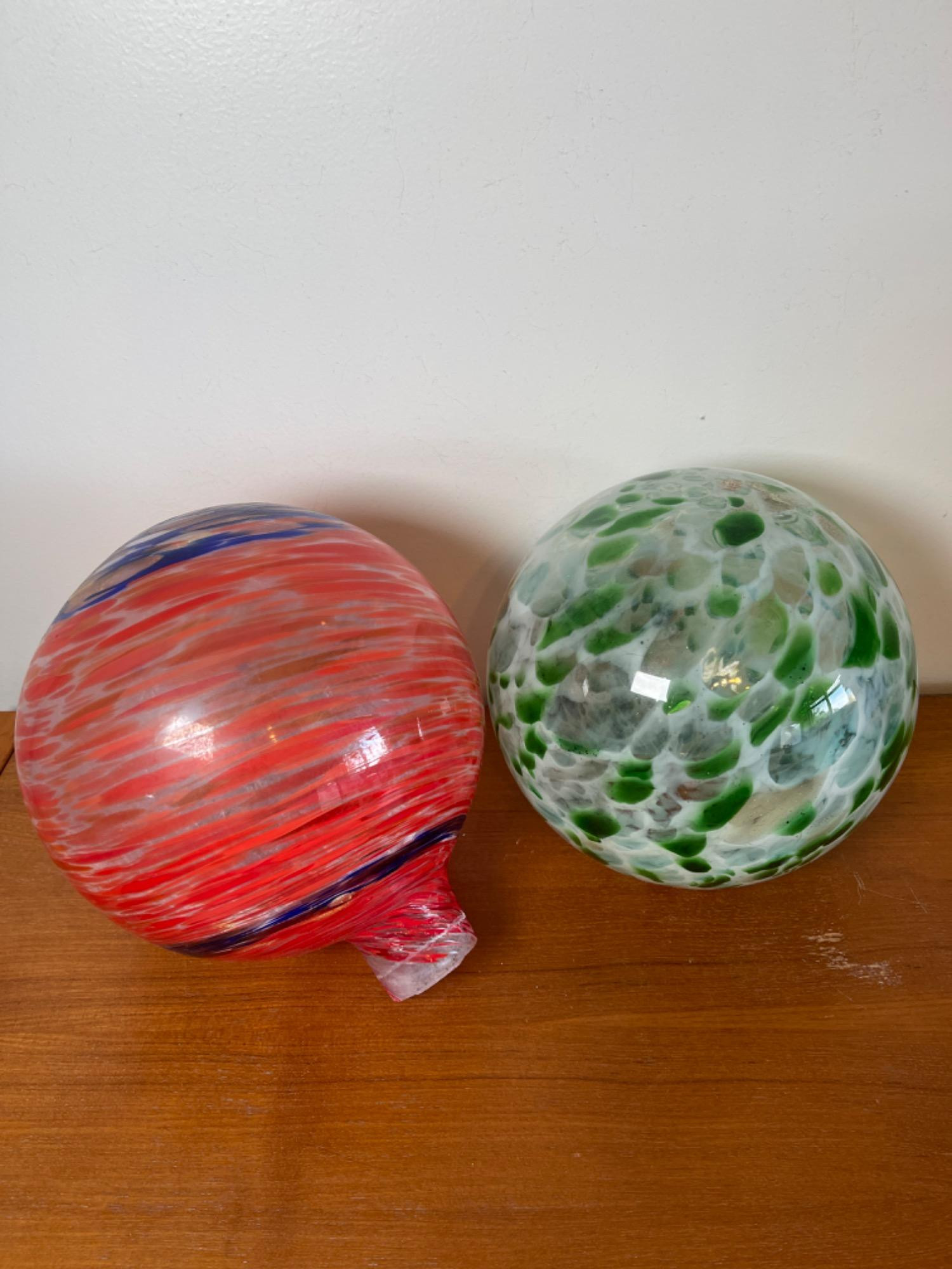 Handblown glass orbs measure approximately 10 inches each. Red one appears to be for a decor garden item. The green one looks like a light fixture.