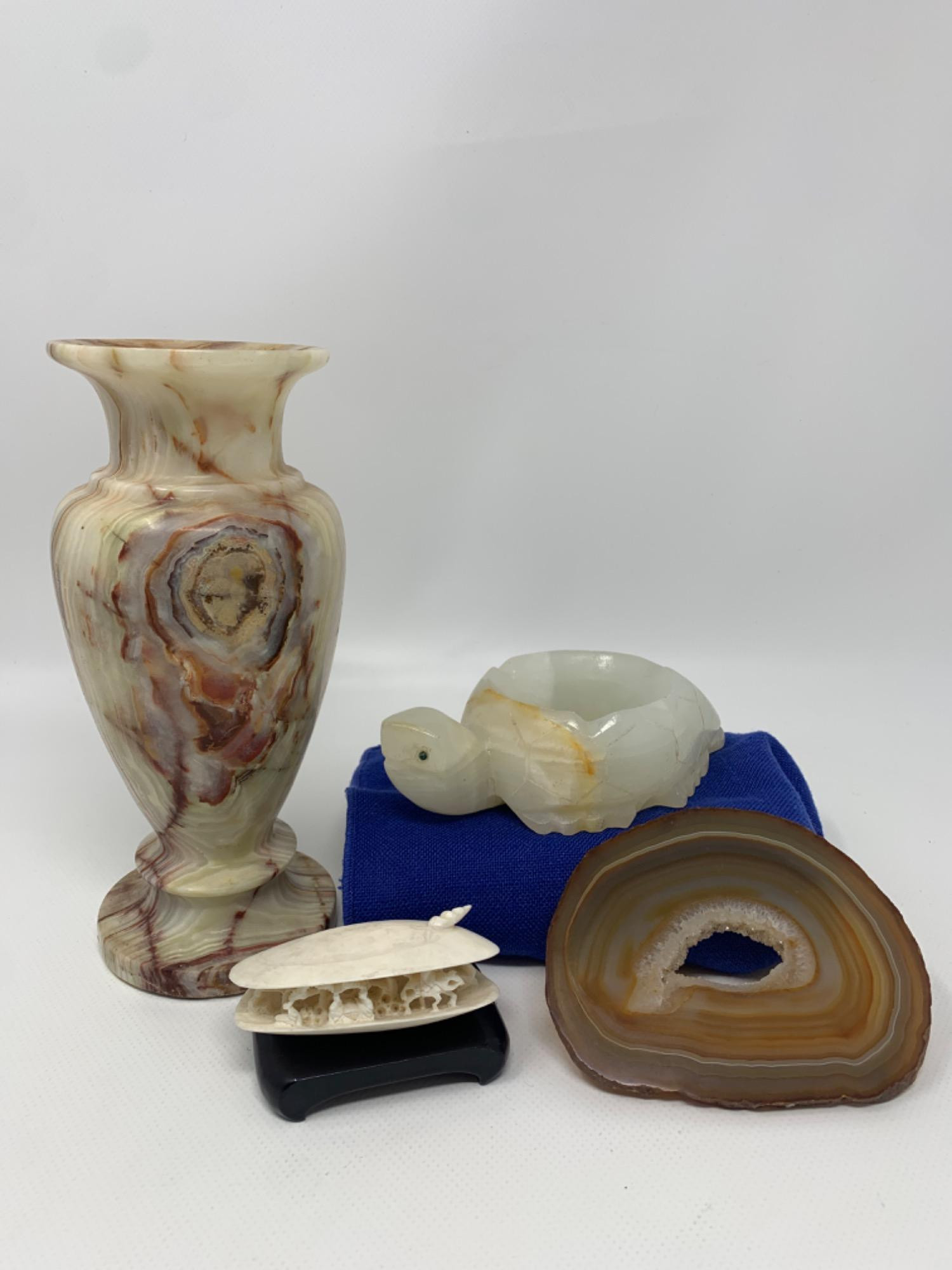 Firoza Onyx vase Dimensions are 8 inches tall, 3.5 inches wide. Bleached shell with delicate and intricate carving inside. Carved stone turtle made in Mexico. Sliced agate.