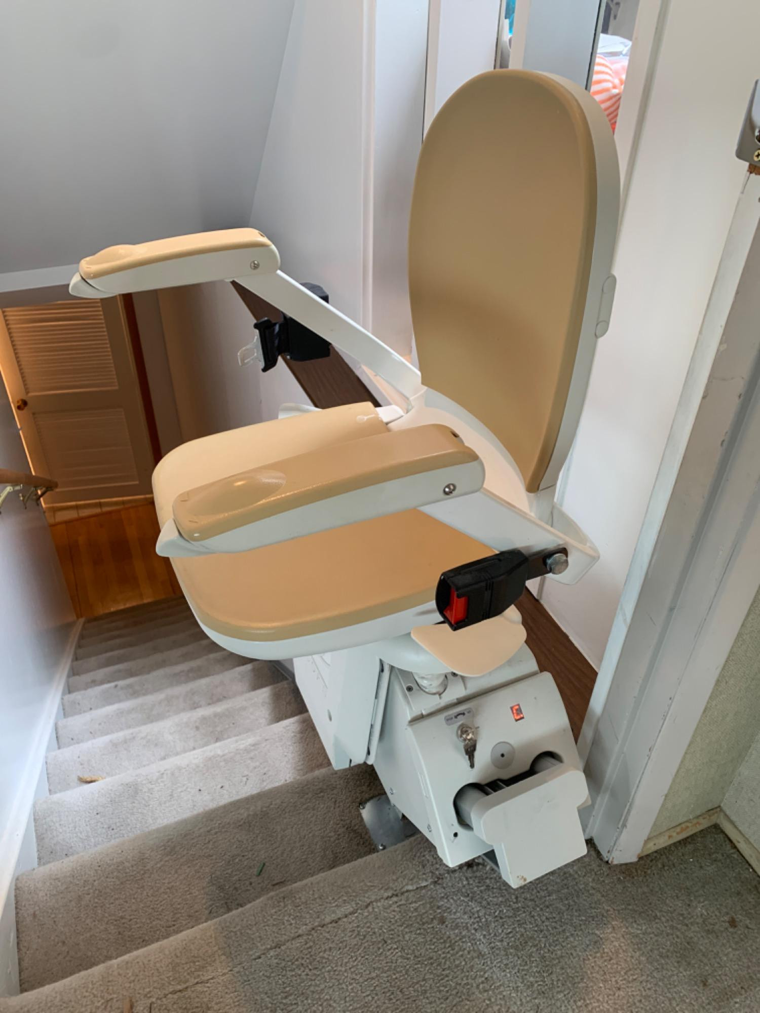 Acorn Superglide 130 Electric Stairlift. CLICK HERE FOR MORE INFORMATION ABOUT THESE STAIRLIFTS 15L x 19W x 39T It works. One remote needs new batteries. Seat pivots and also flips up when not in use. Arm rests have controls also. Must bring tools and support to dismantle.