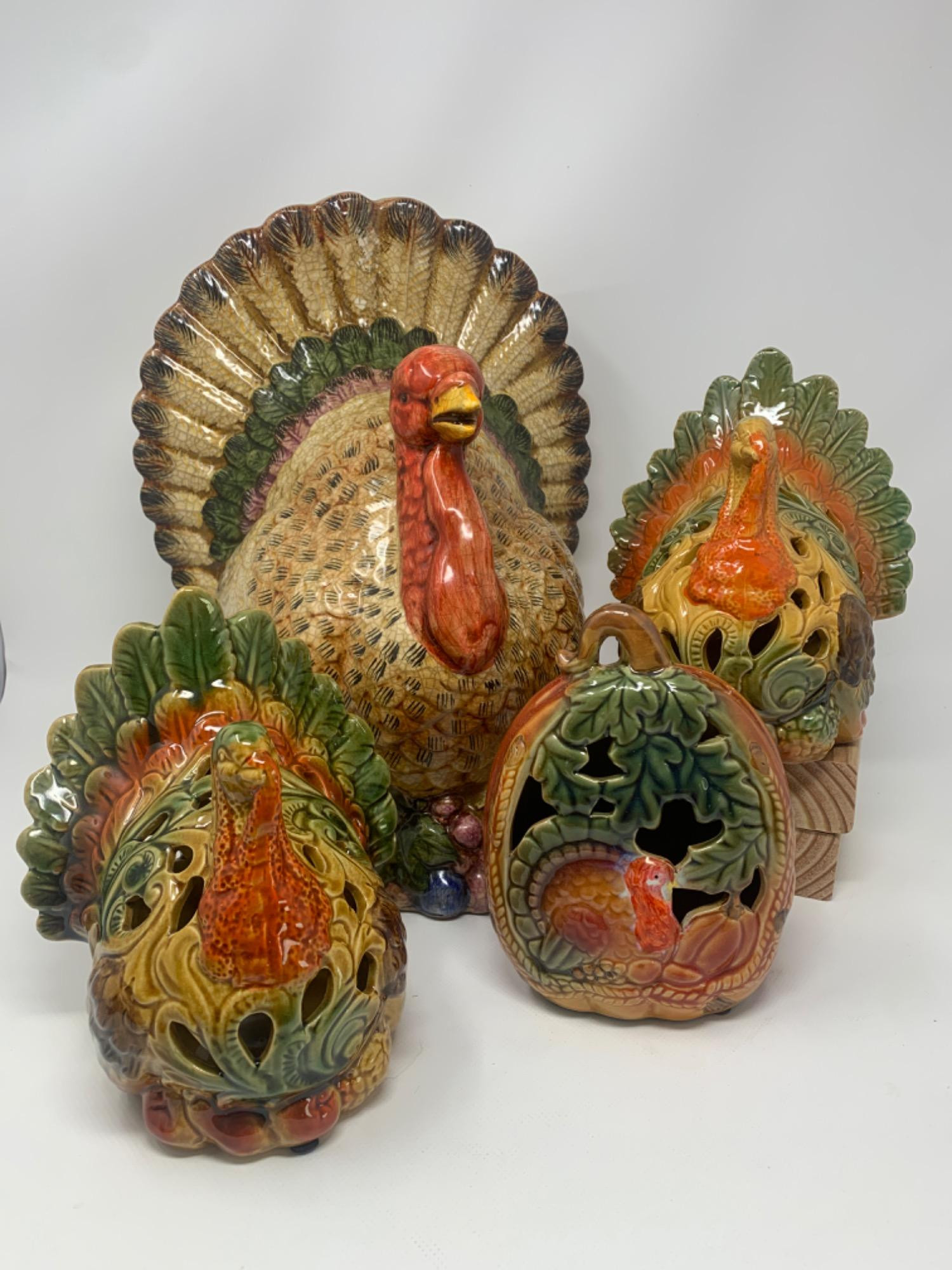 Largest ceramic turkey is 14 inches tall, 10 inches long, 10 1/2 inches wide. Charming holiday decor in autumn colors. One turkey has light inside.