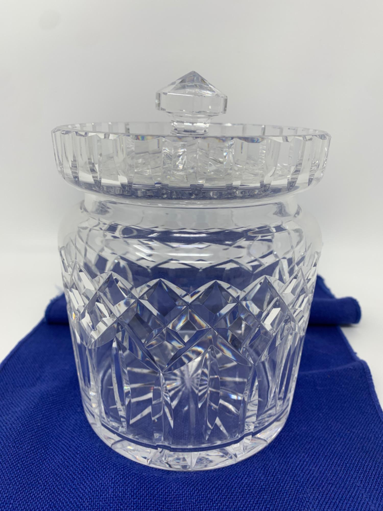 Waterford Crystal Lismore Biscuit Barrel. Dimensions are 7.5 inches tall, 5 inches wide. Waterford label etched on bottom.