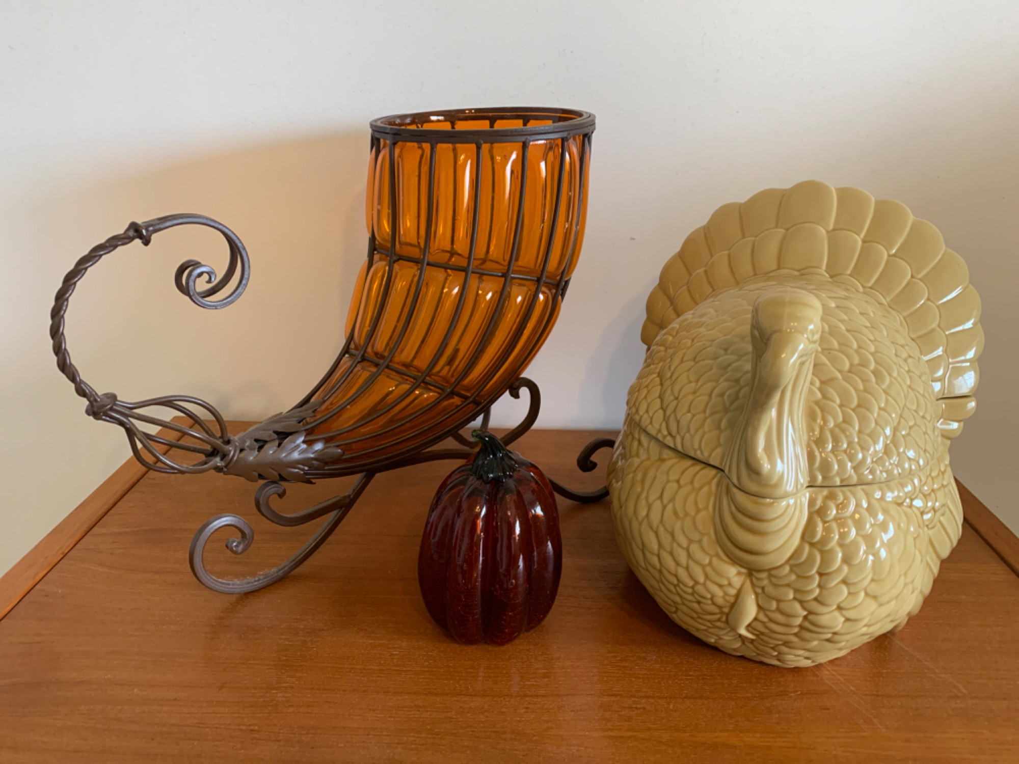 Lot # 94 - Harvest Glass Decor and Large Turkey Cookie Jar