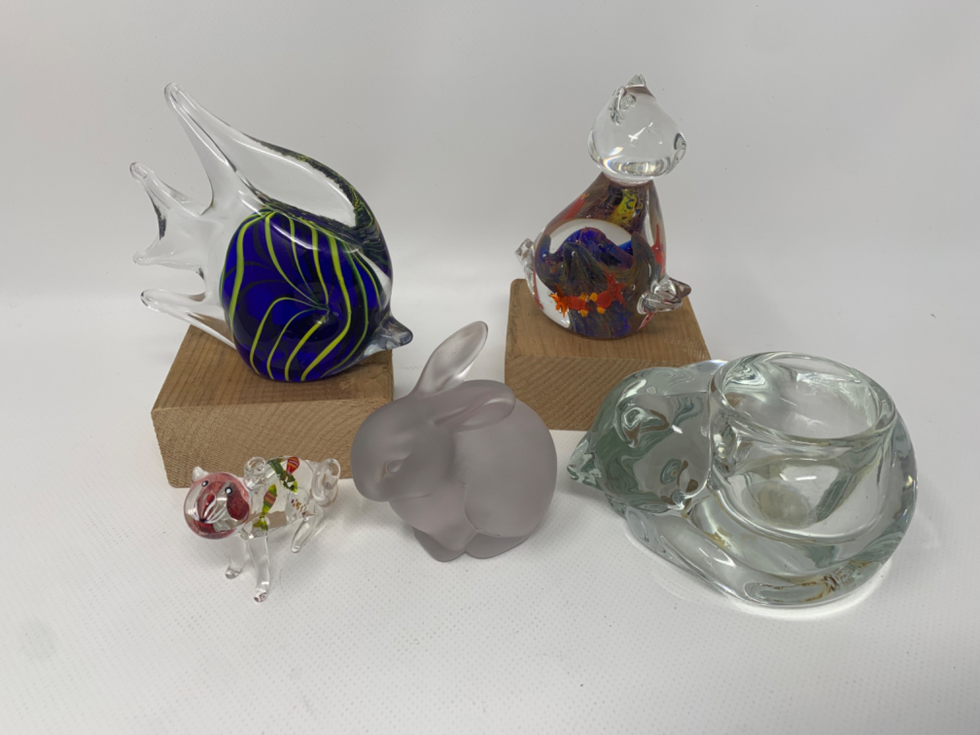Glass cat votive holder, blown glass fish. Frosted Fenton glass rabbit. Painted glass cat ornament. Blown glass cat, with fish inside. Cat has broken tail.