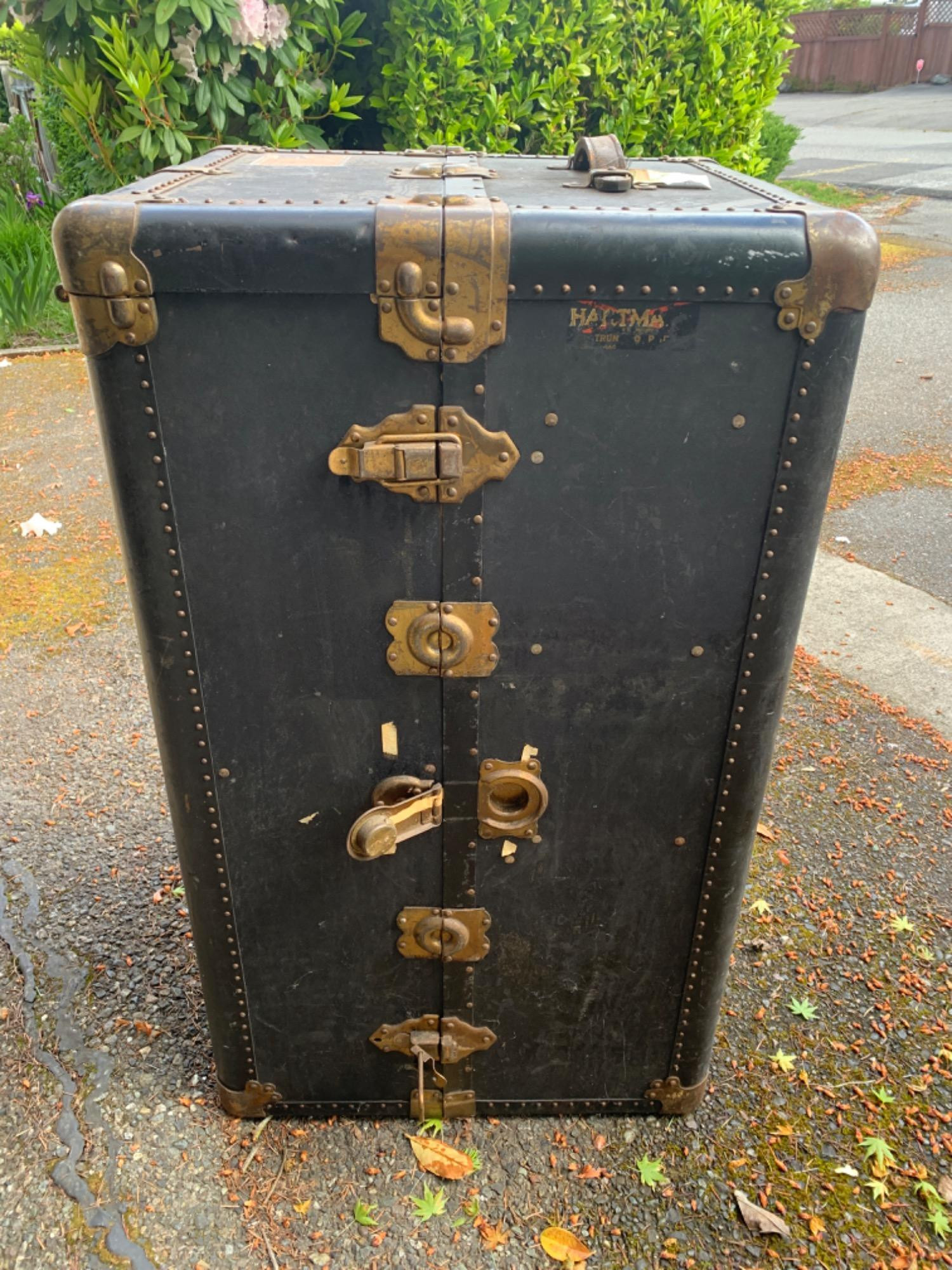 Vintage steamer trunk with closet system. Dimensions are 21in wide, 40in long, 22.5in tall. Drawers have been re-covered with fabric. Leather handle still attached. Key not found.