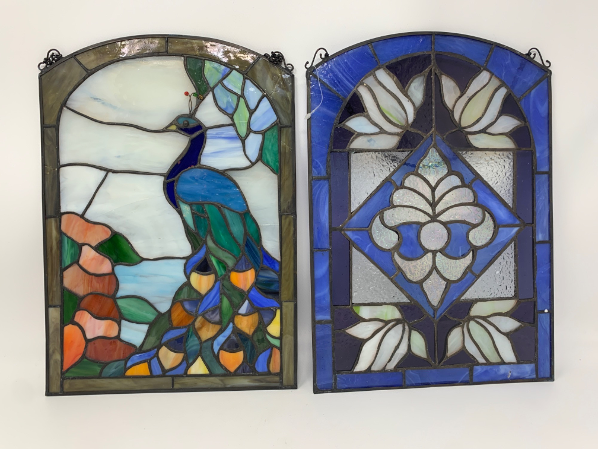 Lot # 98 - Stained Glass Pair, Peacock and Fleur de Lis