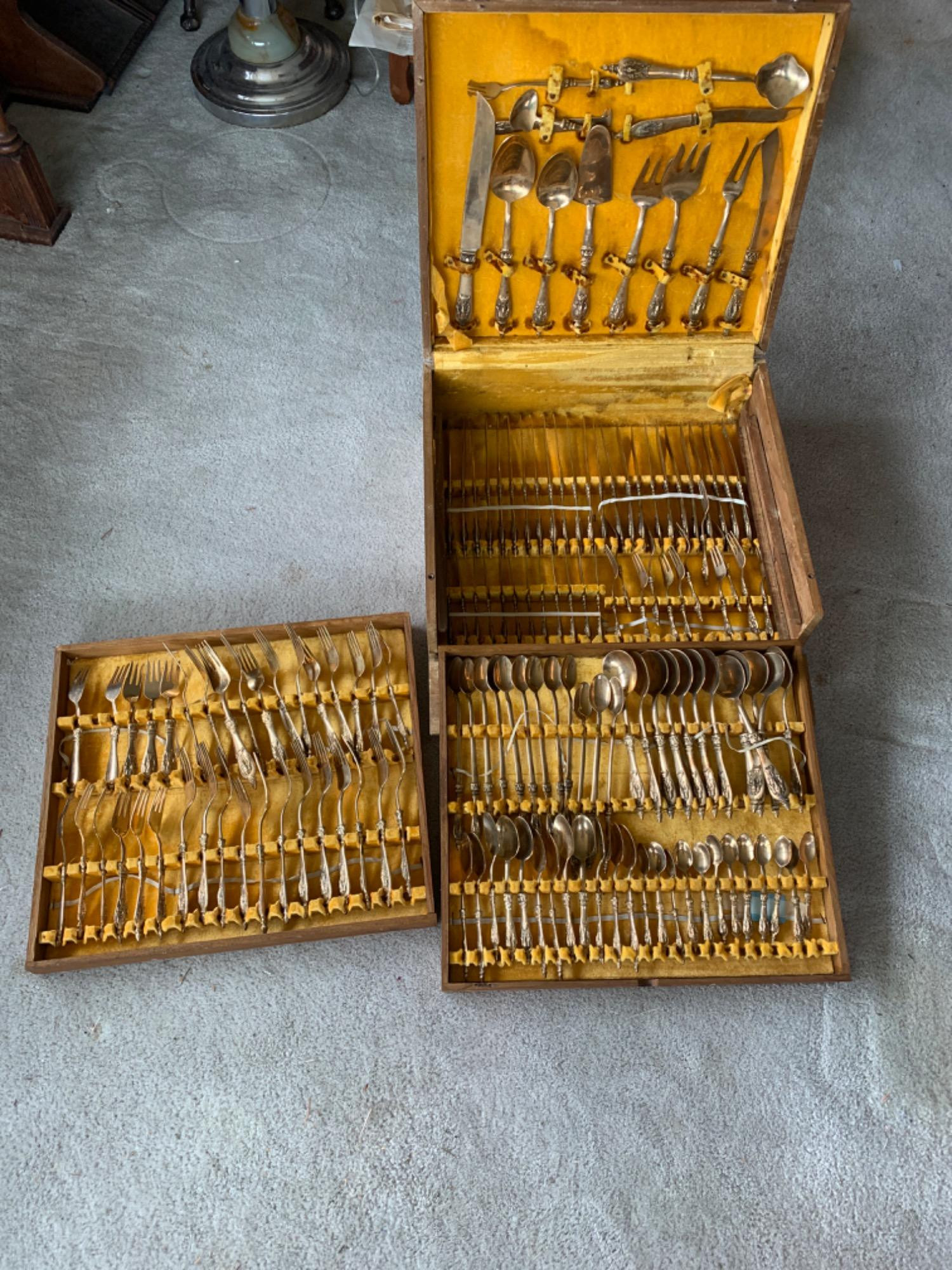 Large wood box loaded with 3 trays of brass flatware. Thai Ganesh elephant detail.