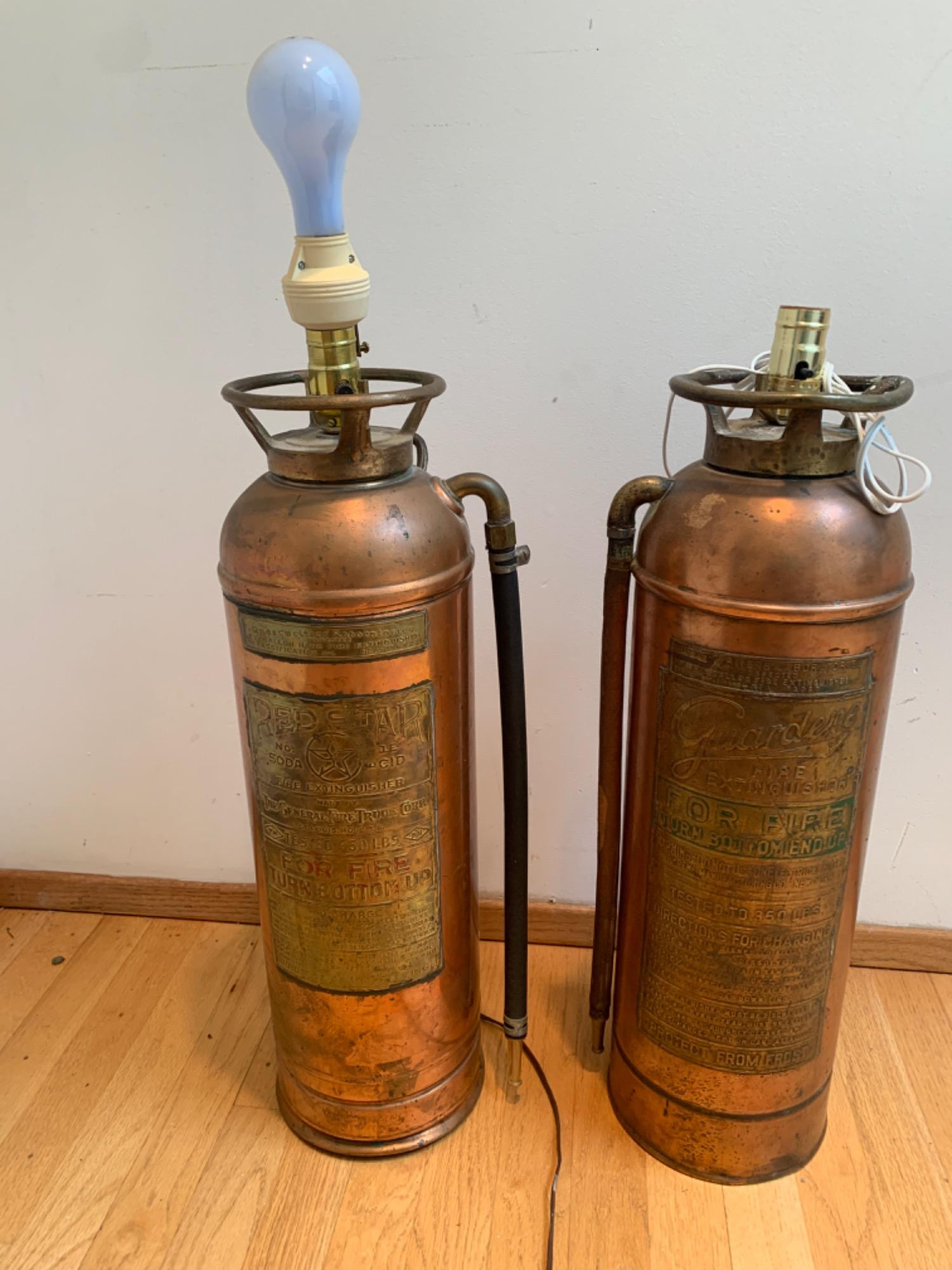 Lot # 129 - Vintage Copper Guardene and Redstar Fire Extinguisher Pair-Lamp Conv