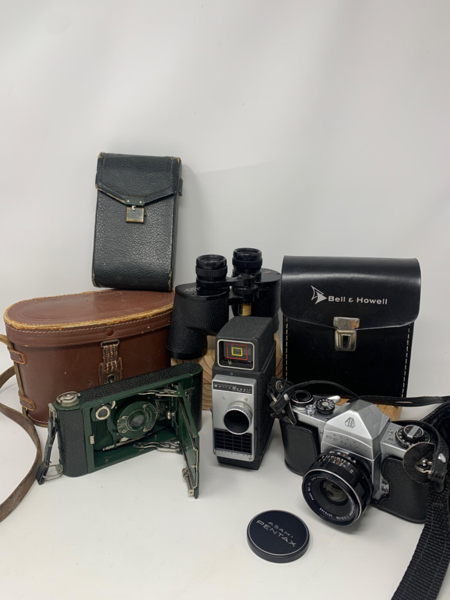 Bell and Howell video camera new inbox. Asi Pentax camera. Manon binoculars with case. Vintage Kodak camera with case.