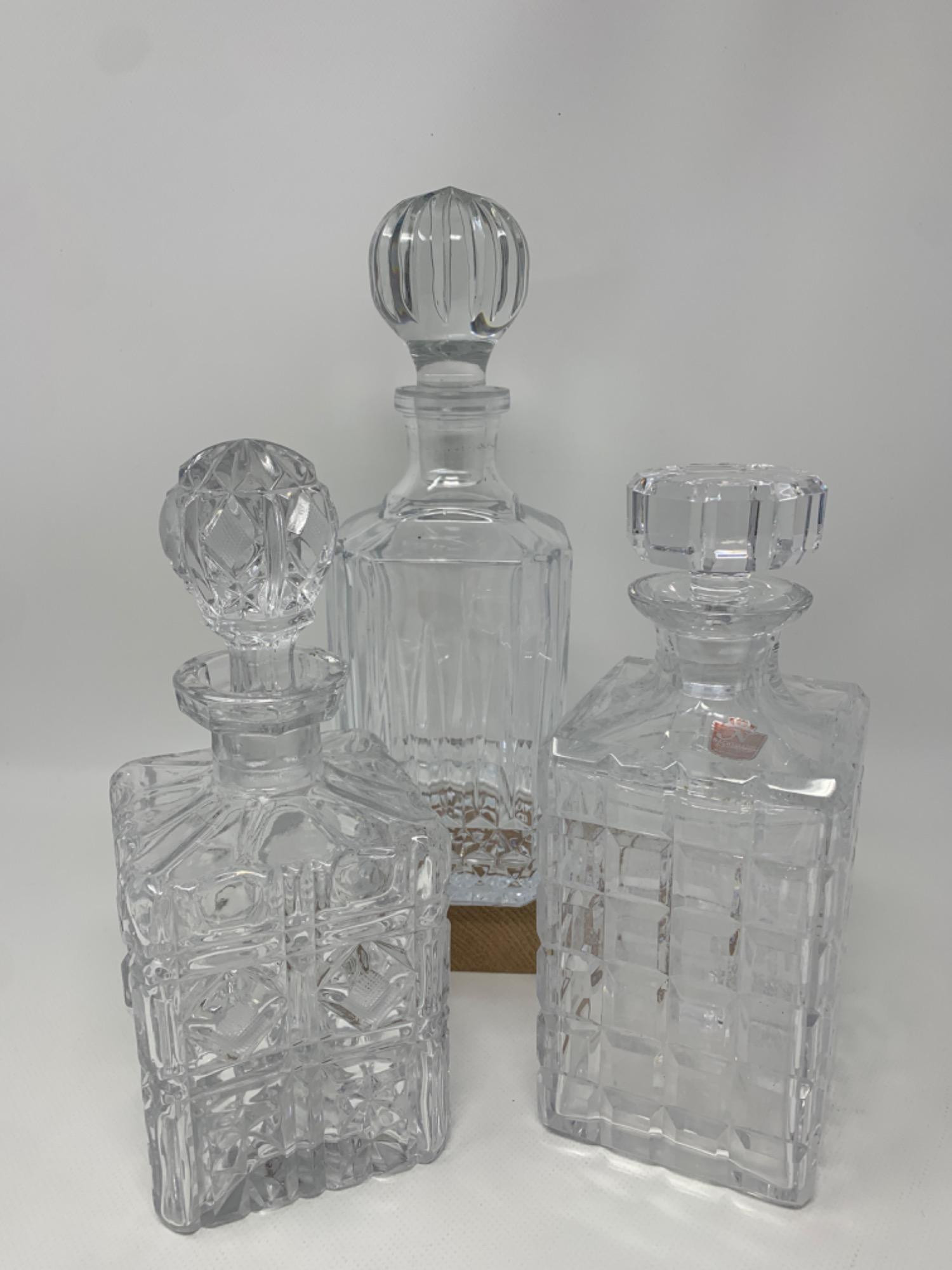 Nice collection of glass decanters. Tallest is 11.5 inches. Heavy glass in variety of patterns.