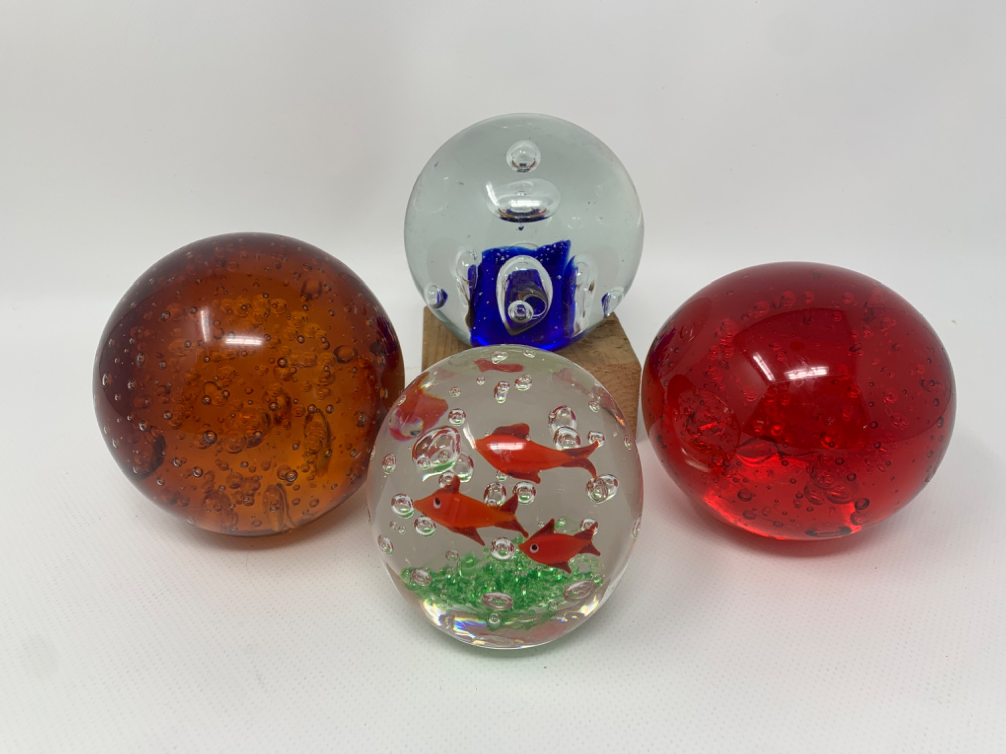Four glass paperweights. One with fish and seaweed floating. One with blue glass inside. One Amber and one red. Amber is largest at 4 1/2 inches tall, 4 inches wide.