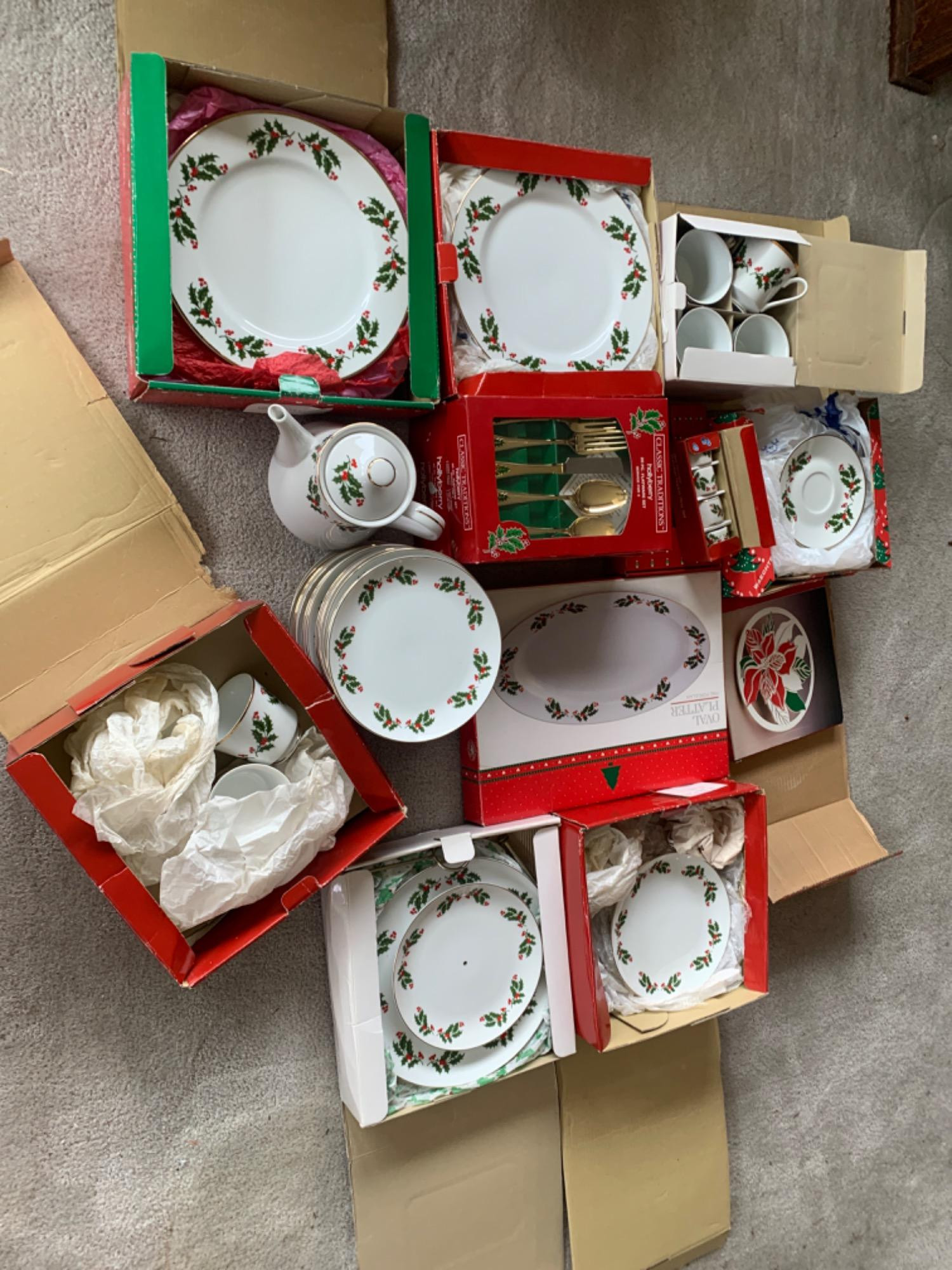 Do you have a large family? Like to entertain at the holidays? This collection is huge. Christmas holly pattern. Serving platters, trivets, flatware, napkin, rings, plates, cups, tea, kettles, and more. Many are new inbox. Several more pieces added when found. Including large candle holder centerpiece.