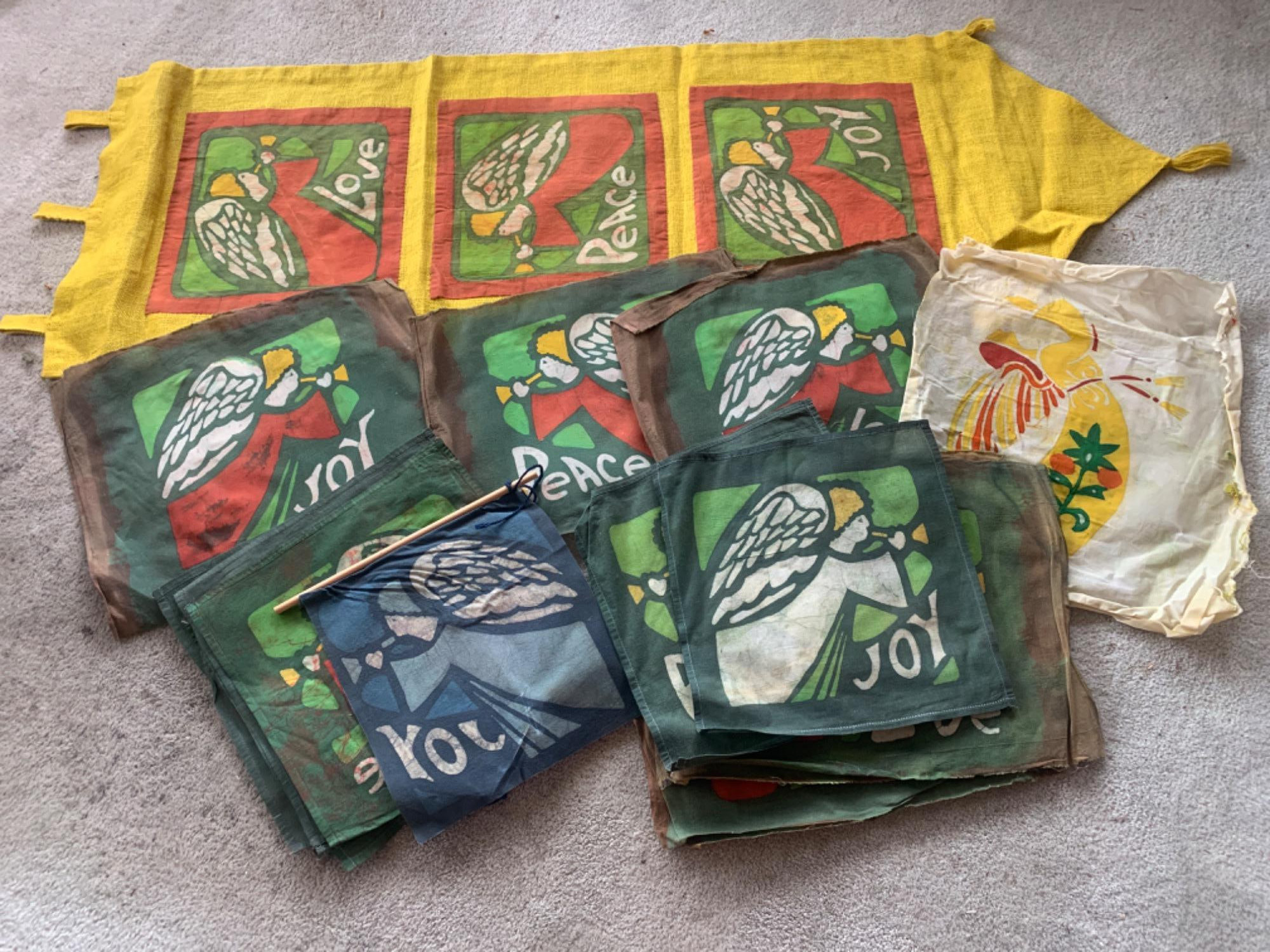 Average size is 15 inches tall, 19 inches long. Joy, love, peace patterns. Some have been hemmed to clean up edges.