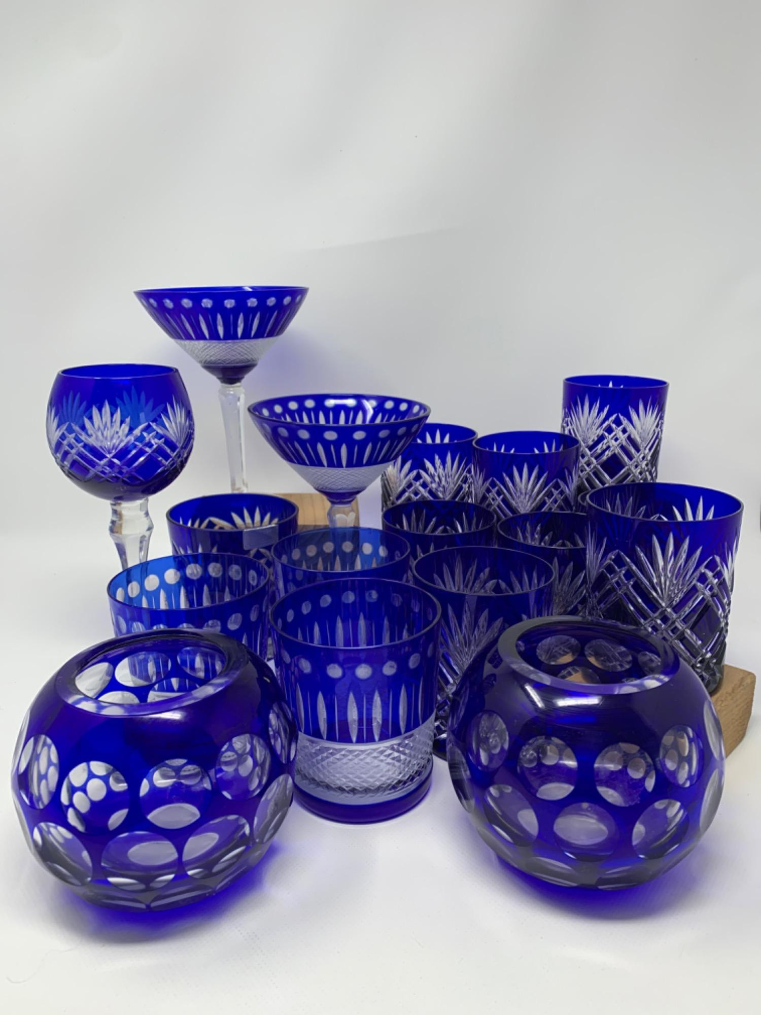 Godinger cut blue crystal glasses, made in Romania. Assorted blue. and clear glass stemware. Blue and clear glass candleholders. Variety of sizes and shapes.