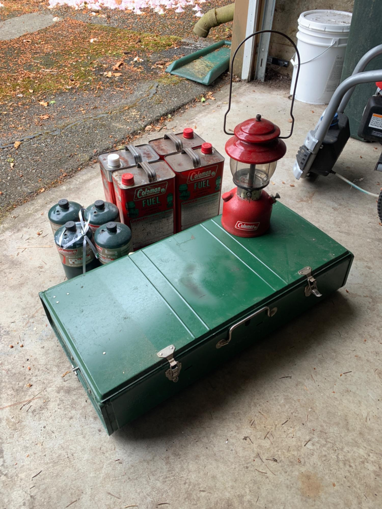 Large Coleman camp stove. Dimensions are. 28 inches long, 13.5 inches wide, 6 inches tall. 4 Large cans of Coleman fuel. four cans of Coleman propane fuel. Vintage Coleman gas lamp. 19.5 inches tall.