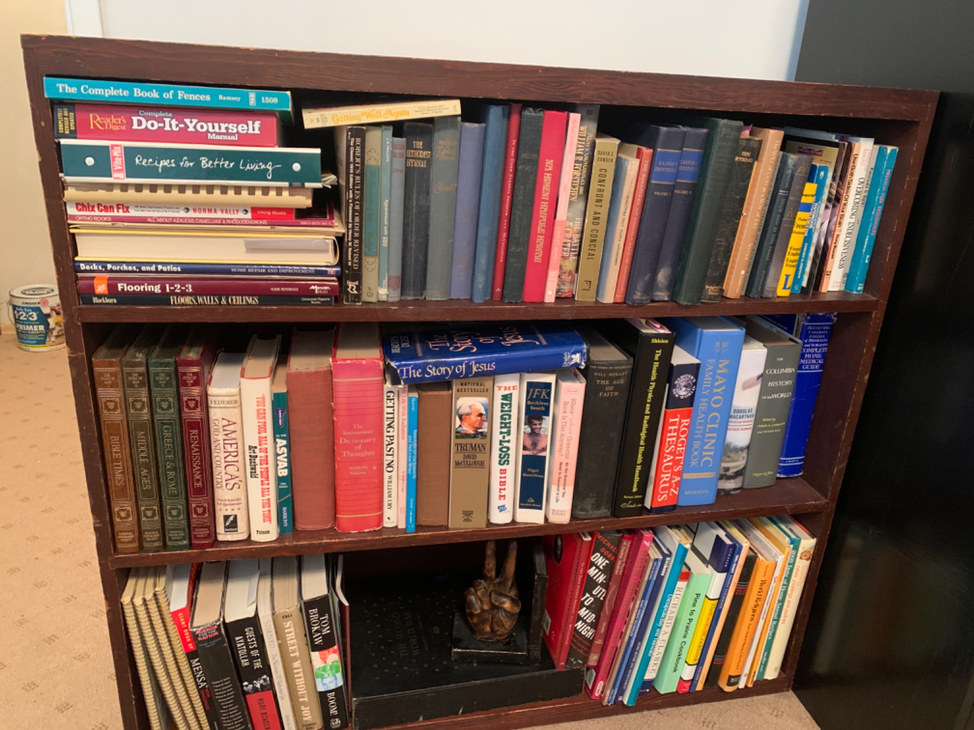 Bookcase Full Of Books. All wood bookcase. Dimensions are 42 inches long, 12 inches wide, 39.5 inches tall. Vintage books, cookbooks, home improvement, books, political, religious, medical and more.