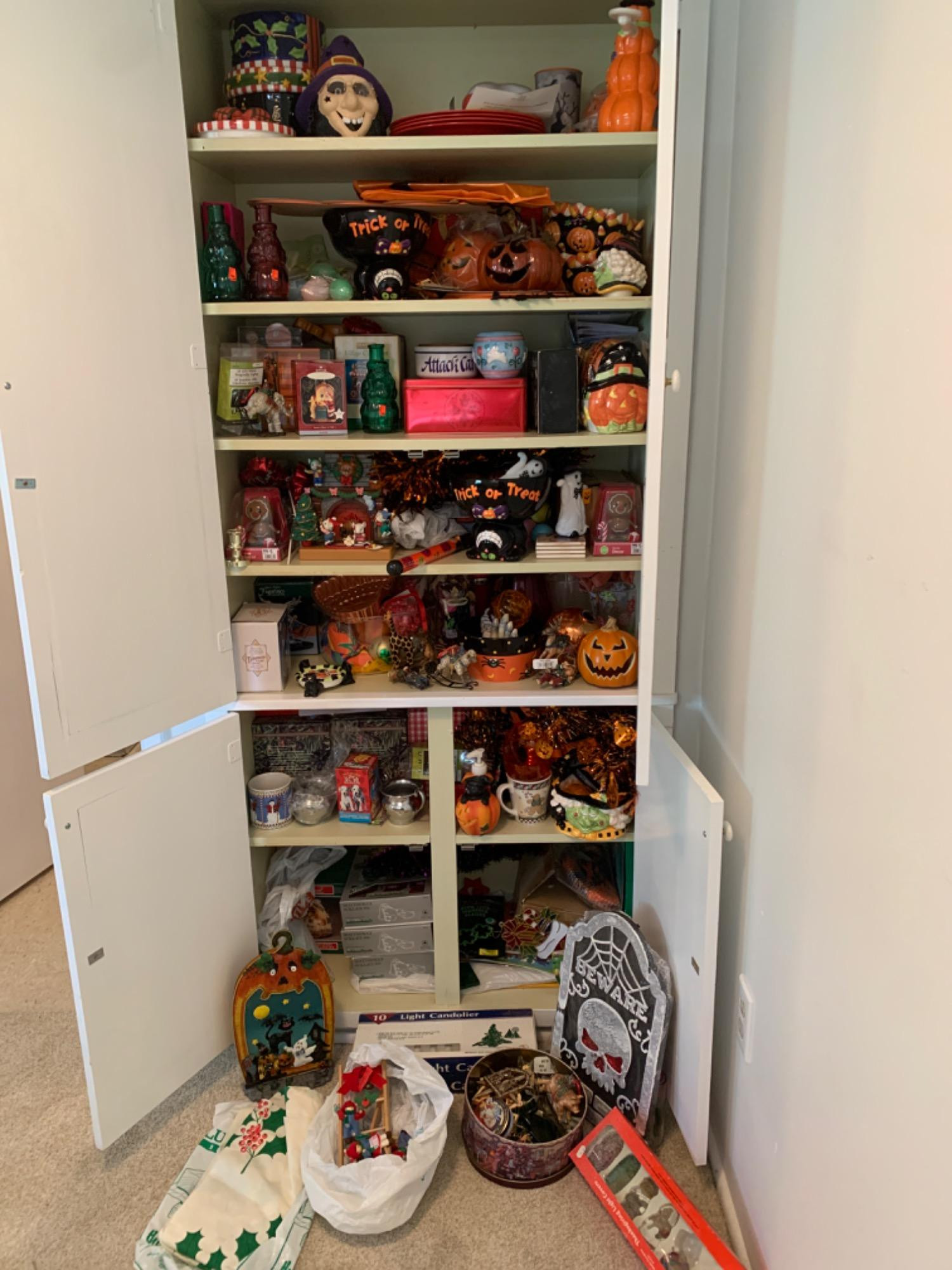 Everything In The Cupboard Is Yours – Holiday Cupboards full of holiday decor. Some. Vintage and some new. Huge lot of Halloween, Christmas, Easter, patriotic and more. Bring your boxes there’s a lot here.
