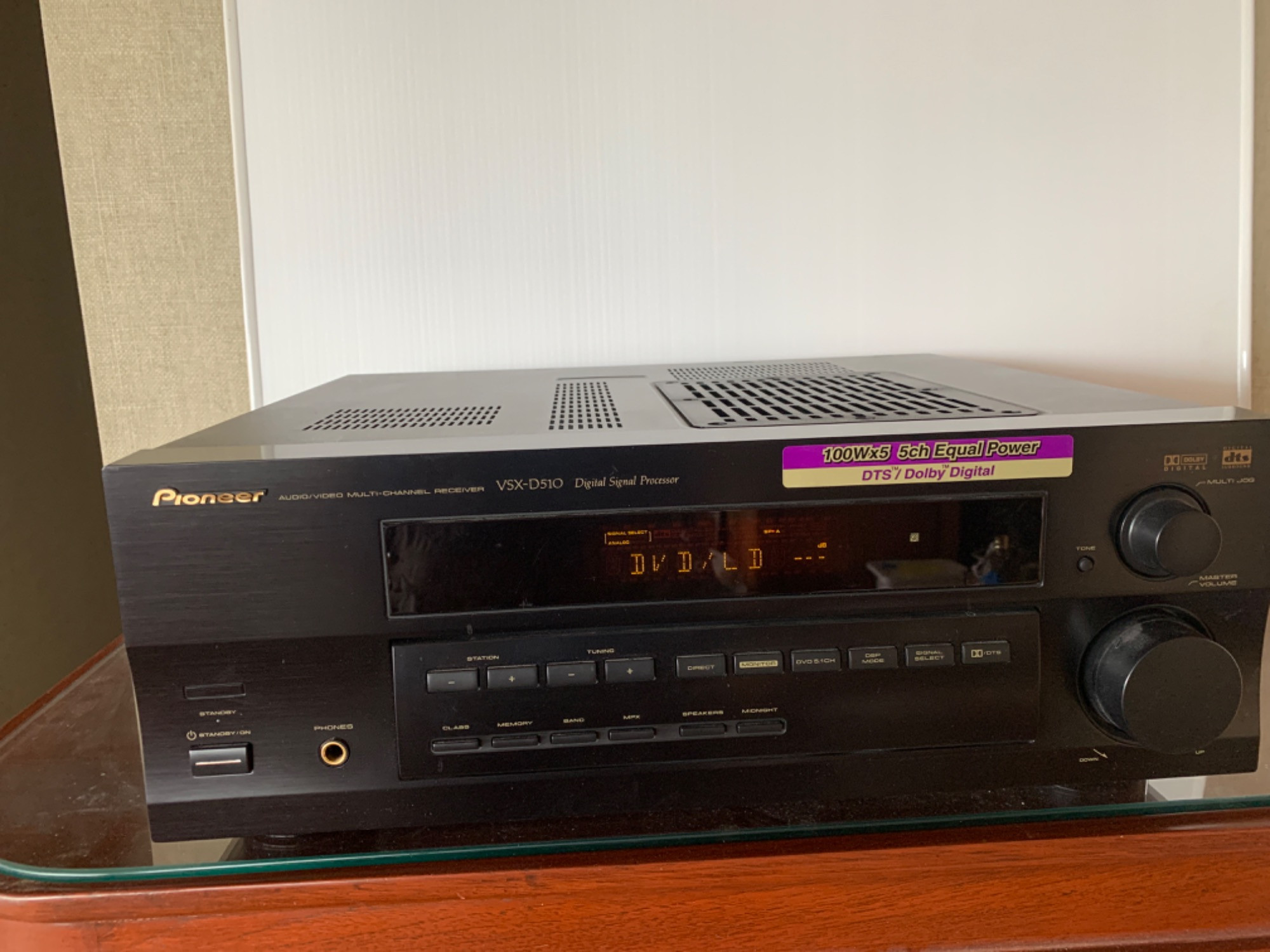 Pioneer audio video multi channel receiver. Model VSX – D510. Powers up. Dimensions are 16.5 inches long, 15 inches wide, 6 inches tall.