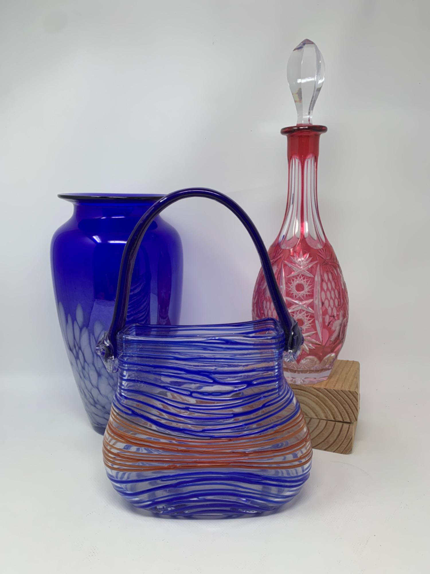 Handblown Glass Purse, Blue Vase, Red Crystal Cut Glass Decanter. Purse dimensions are 12 inches tall, 8 inches wide. Decanter dimensions are 14.5 inches tall. vase is 11.5 inches tall, 6 inches wide.