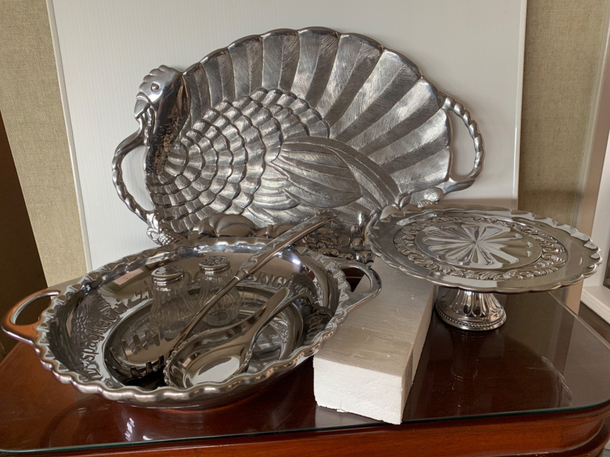 NIB Lennox Silver Toned Feasting Dishes. Large turkey platter dimensions are 24 inches long, 16 inches tall. Possible is 18 inches wide. All items new inbox.