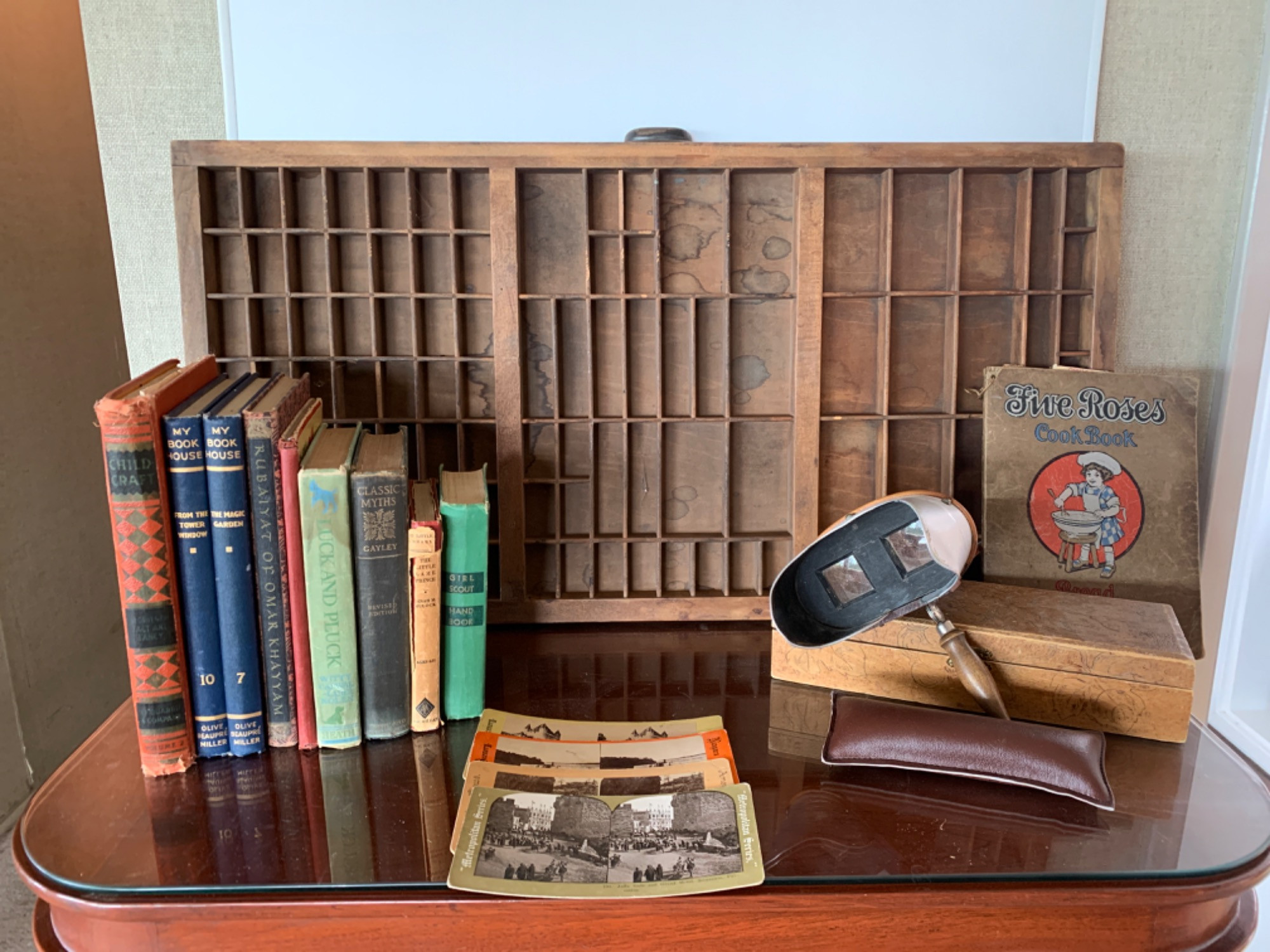 Vintage Stereograph, Books and Letter Press Tray. Letter press tray dimensions are 32.25 inches long, 17.5 inches wide. Several vintage children’s books. Vintage stereograph with box and movie cards.