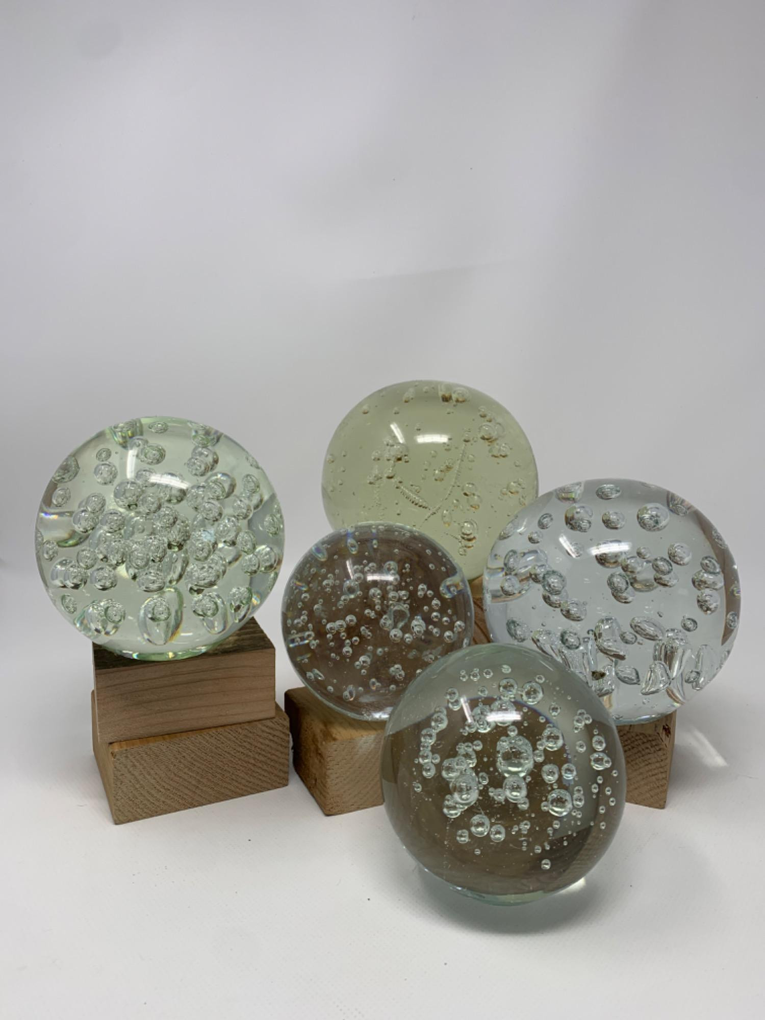 Clear Glass Bubble Paperweight Set. Largest paperweight is 5 inches wide, 5 inches tall. One is slightly yellow. Variety of bubble sizes and intensity. None signed.