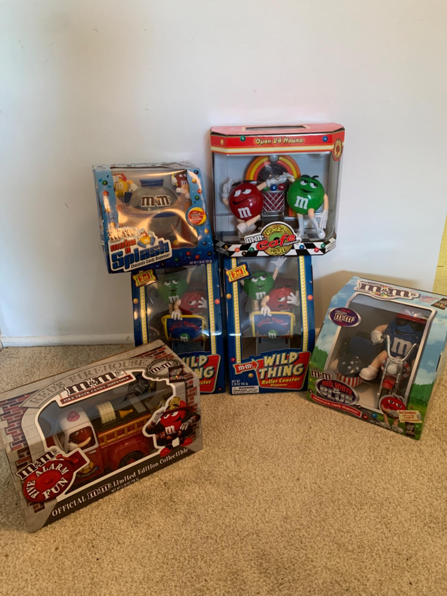 In The Box Vintage Six vintage M&M candy dispensers. Two identical wild thing, roller coaster. Rock and Café, make a splash, red, white and blue motorcycle dispenser, and firetruck dispenser. All are new inbox.