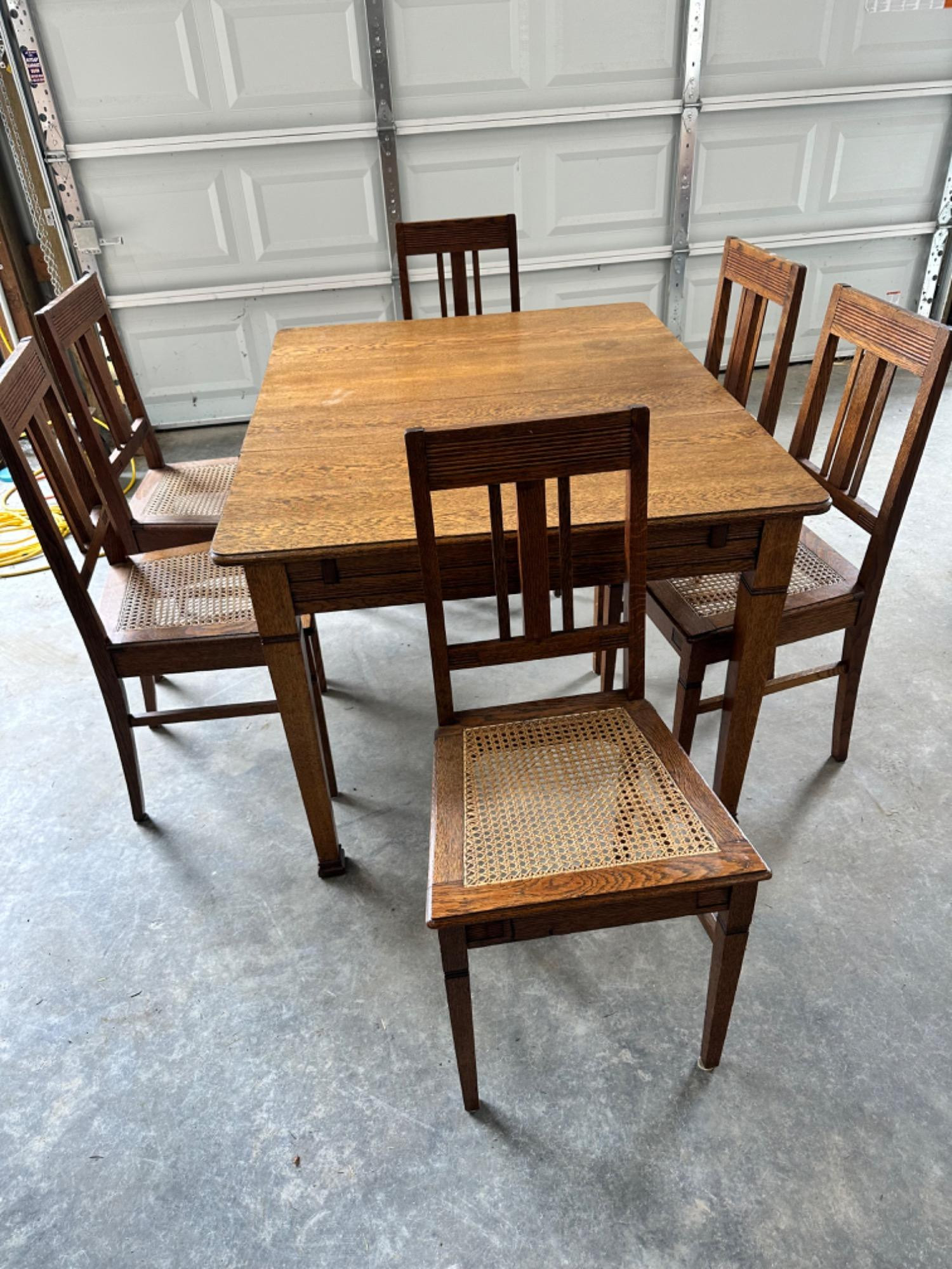 Antique Solid Wood Table With Solid Wood Cane Chairs. Table measures= 49L x 39W x 30T Chairs 37.5 T (to top of chair) x 18W x 17D Chairs have cane seating that is in excellent condition. Table is very well maintained. It comes with 3 leaves, the leaves wood grain does match the table. Bidding on this lot is an agreement that: (1.) You