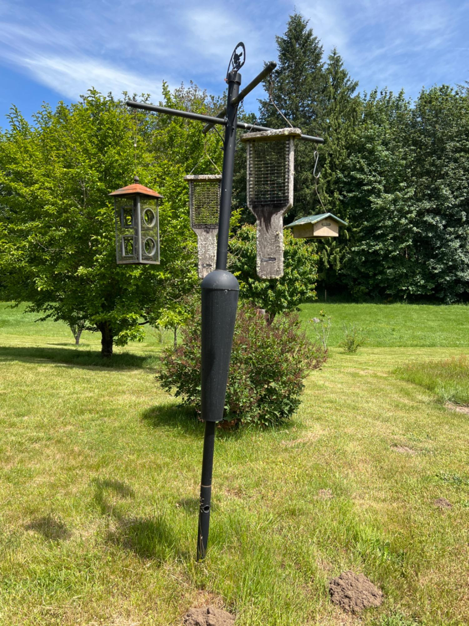 At least 100” tall pole. Four feeders. Feeder bird house 4 x 9 Feeder rack 21 x 9 Square metal feeder 12 x 9 squared Designed to keep squirls off