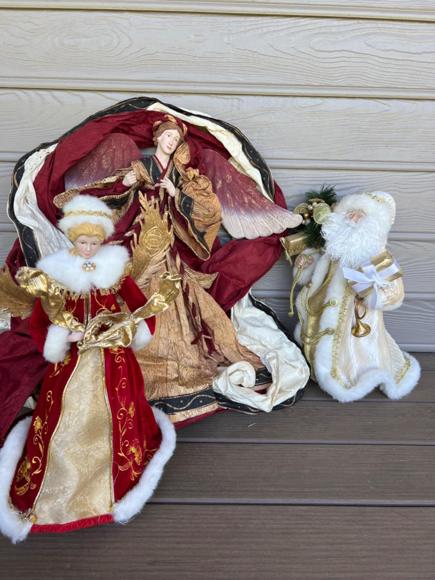 Angel wreath, made in Phillipines, 23” tall and 23” wide. Treetoppers are 17” tall. Santa’s plastic cone is damaged.